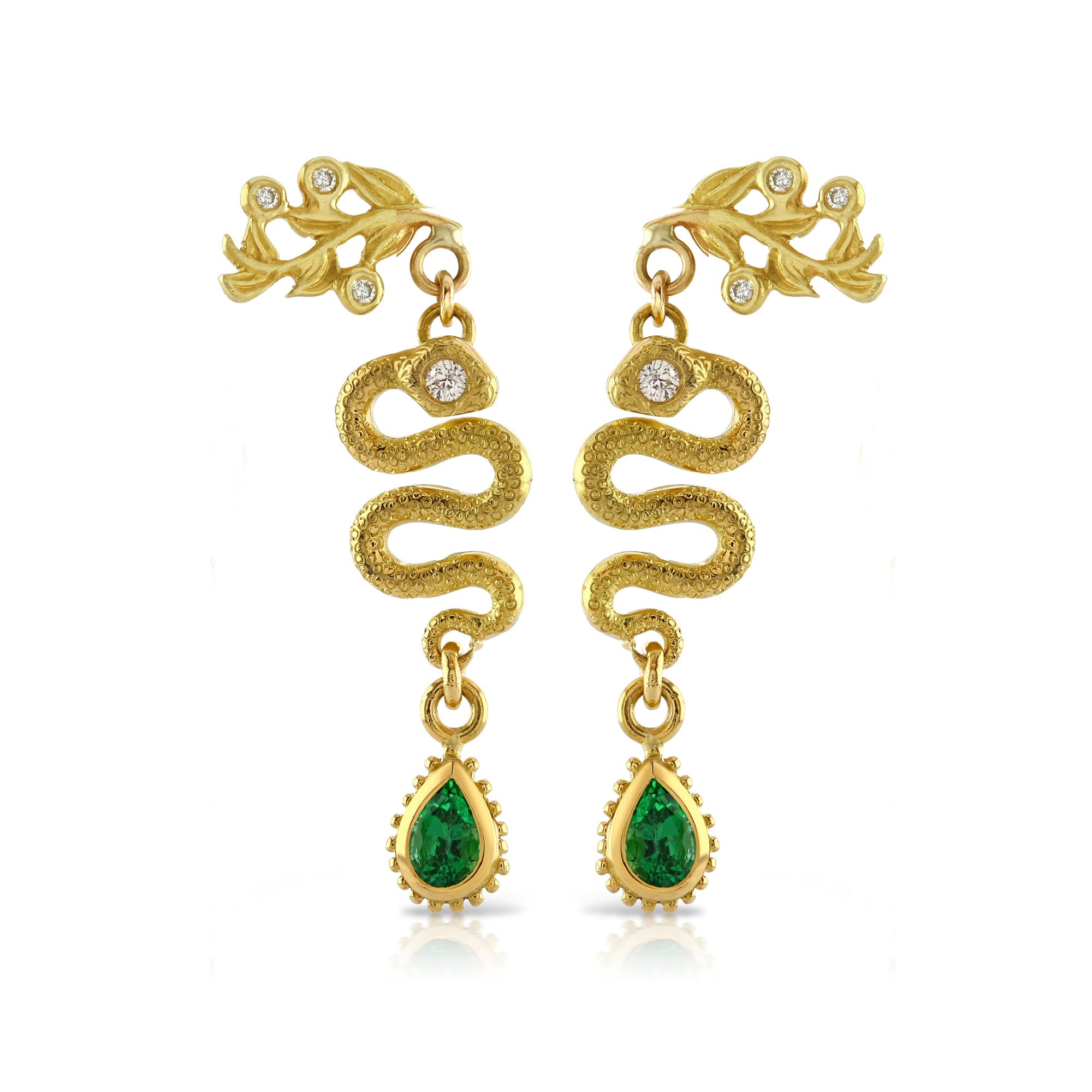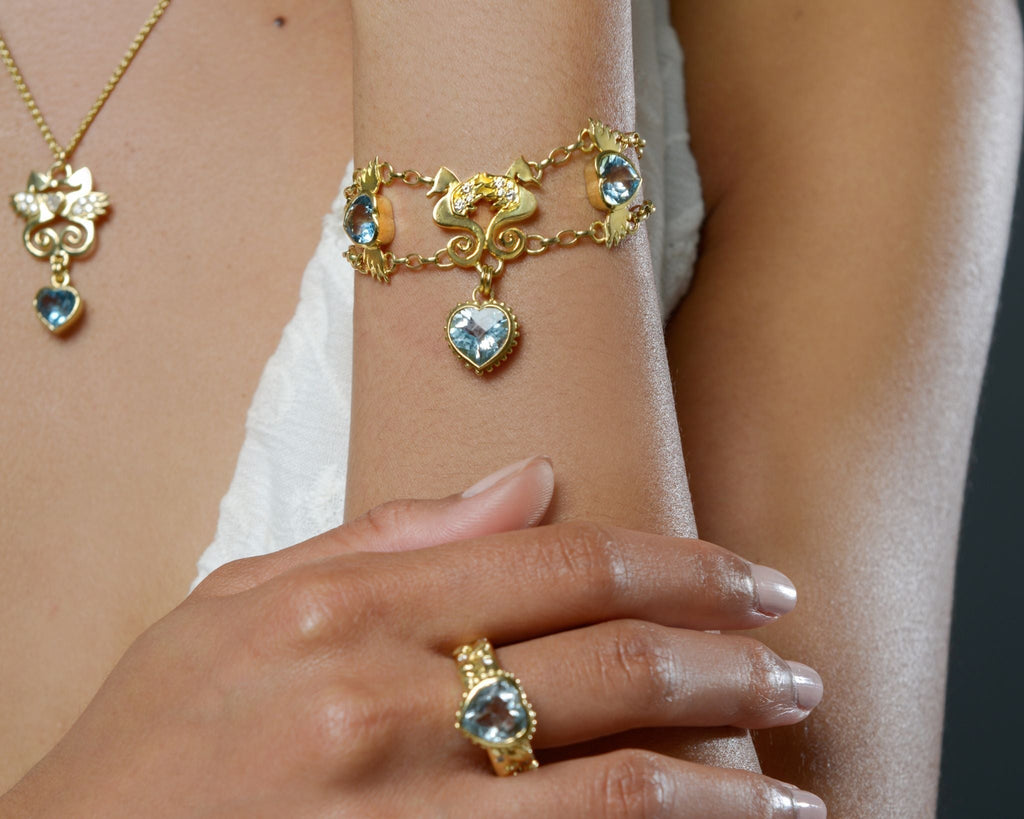 Left to right: Salacia Earrings, Aquamarine Tutti Frutti Rings, Garden of Eden Earrings