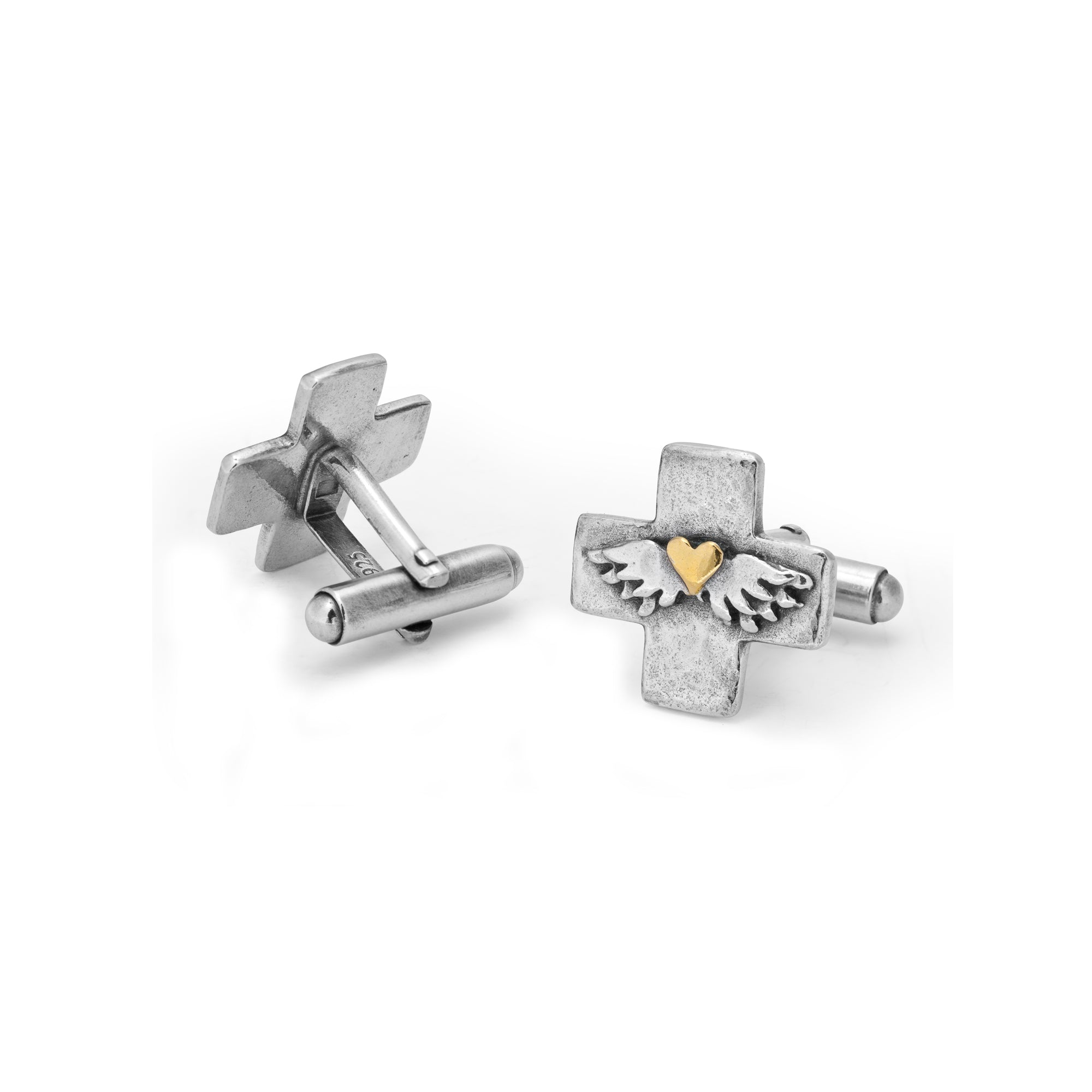 Left to right: Mini Algerian Loveknot Cufflinks, Classic Winged Heart Tie Slide, Bellini Cross Cufflinks