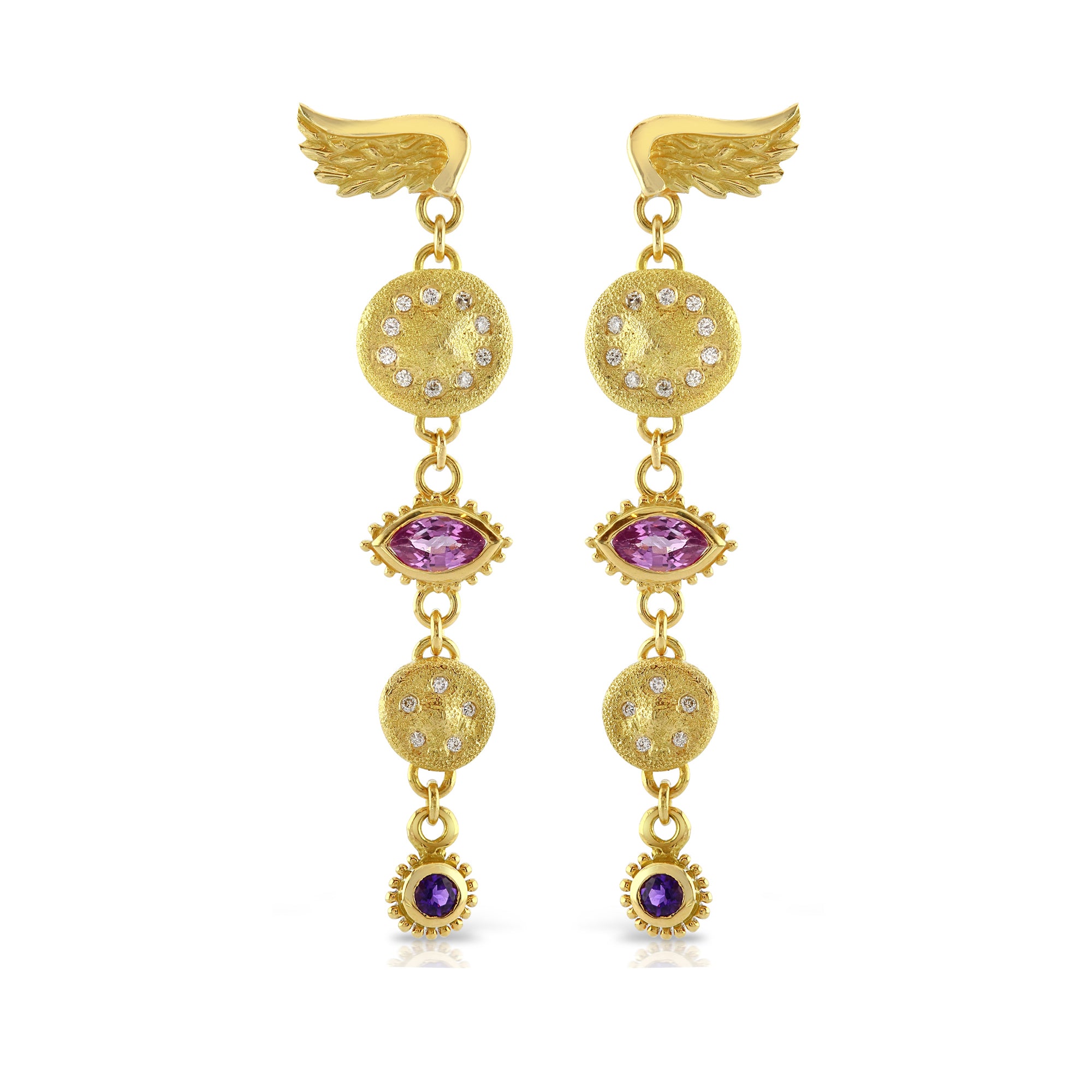 Left to right: Heavenly Earrings, Gold & Diamond Luna Cluster Necklace, Gold & Diamond Venetian Wing Studs