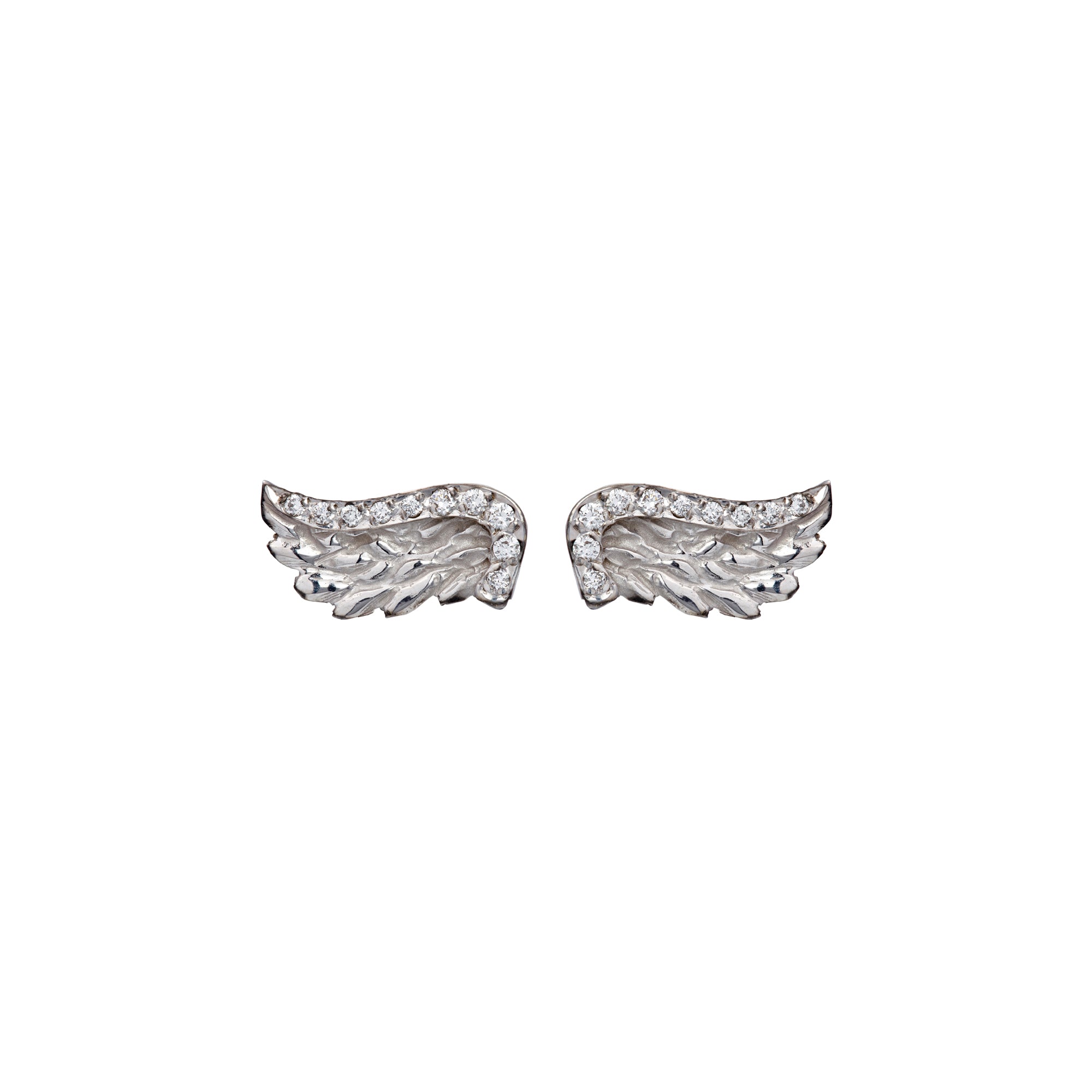 Left to right: White Gold Diamond Venetian Wing Necklace, White Gold Classic Winged Heart Bracelet, Bond Circle Earrings