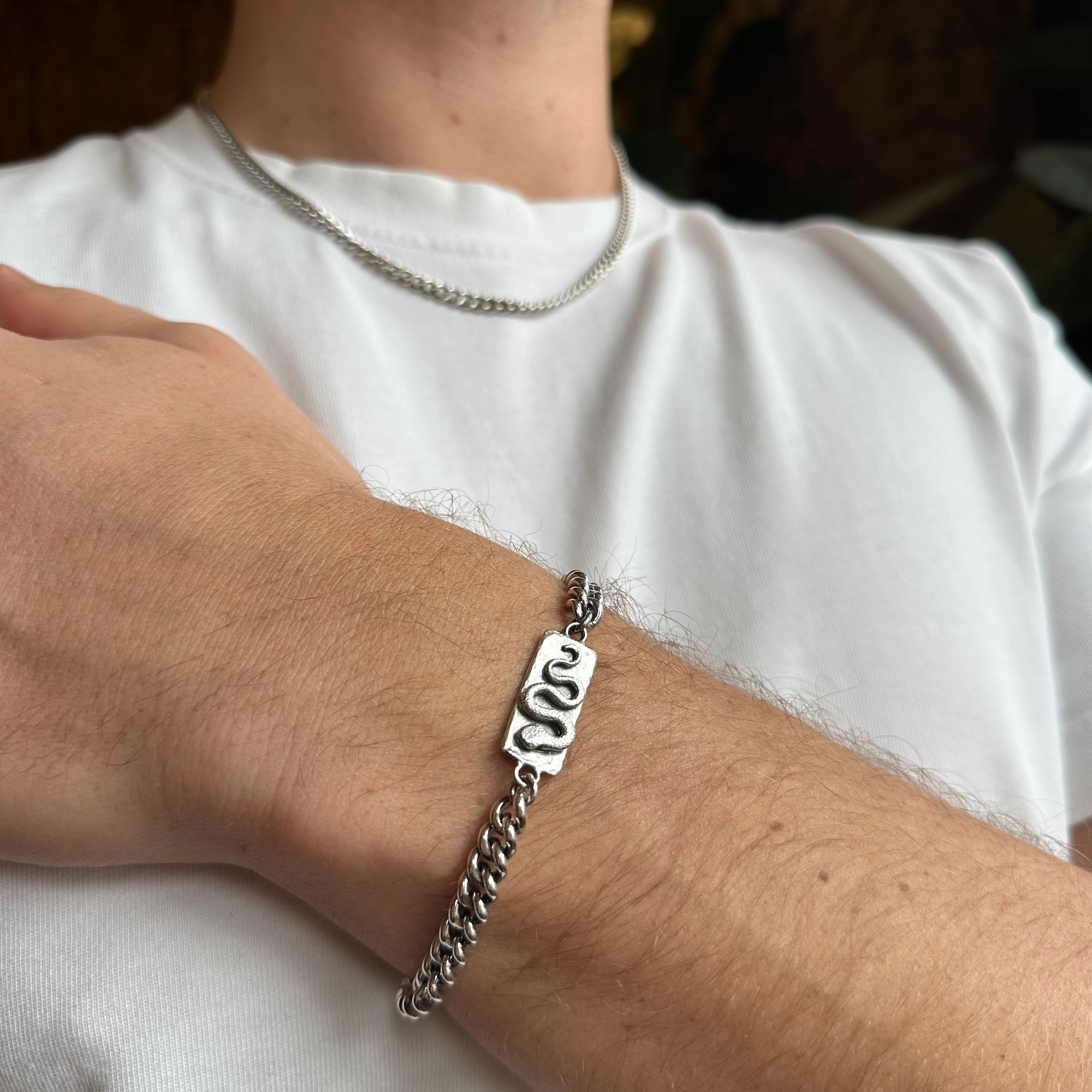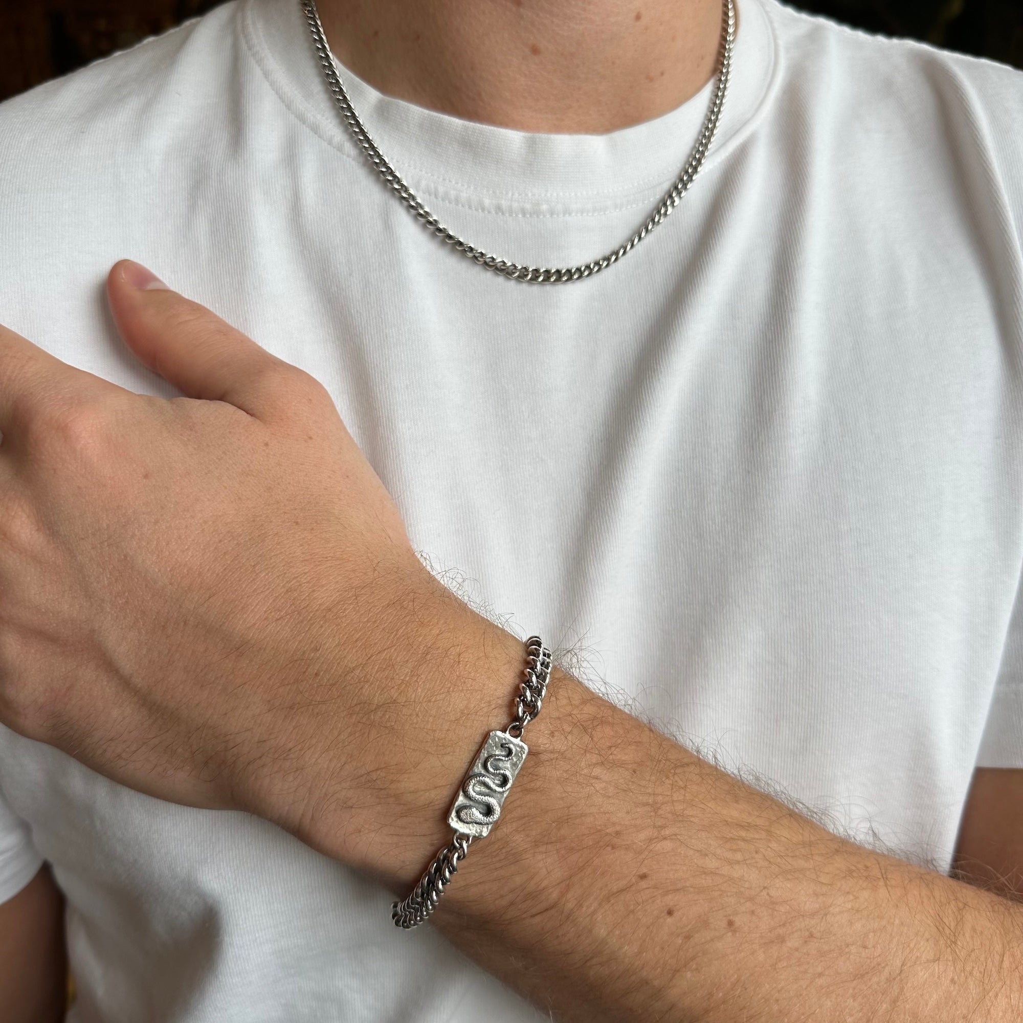 The central detail of this bracelet features an intricately engraved serpent layered on to a section of silver with a hammered finish with an overall diameter of 24x11mm.
