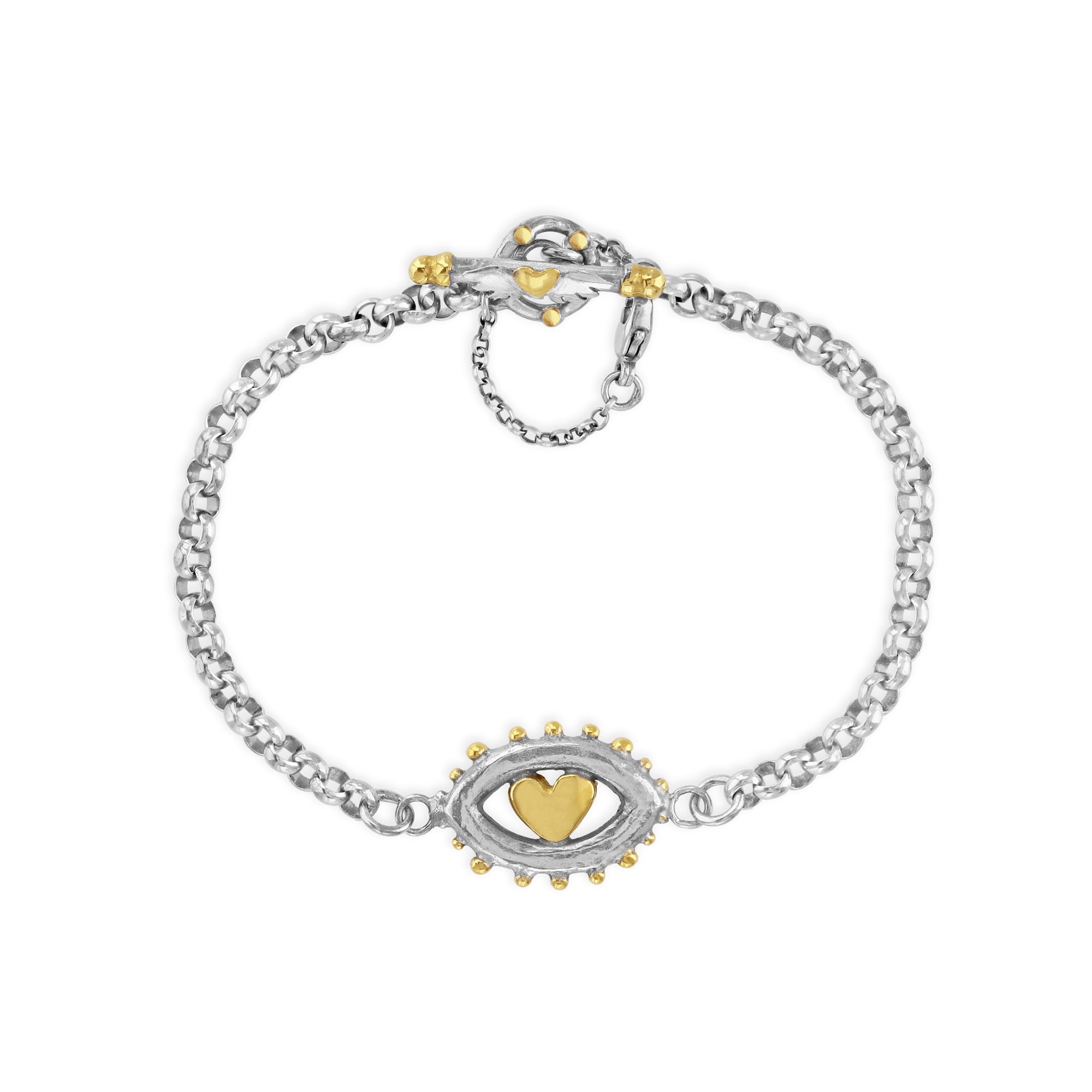 This striking bracelet is crafted in sterling silver with gold plated detail, featuring an eye motif that symbolises protection and More than just a bold statement piece, it serves as a modern amulet — a symbol of strength and clarity, beautifully realised through Sophie’s refined design. Pairs perfectly with the Chunky Eye Amulet stud earrings. .