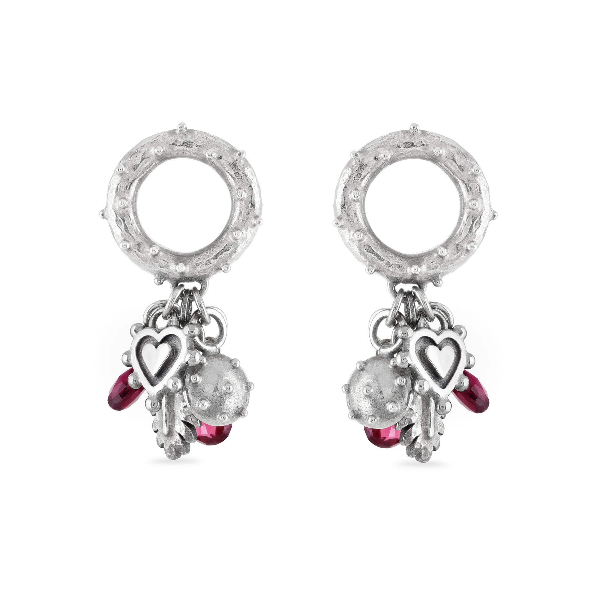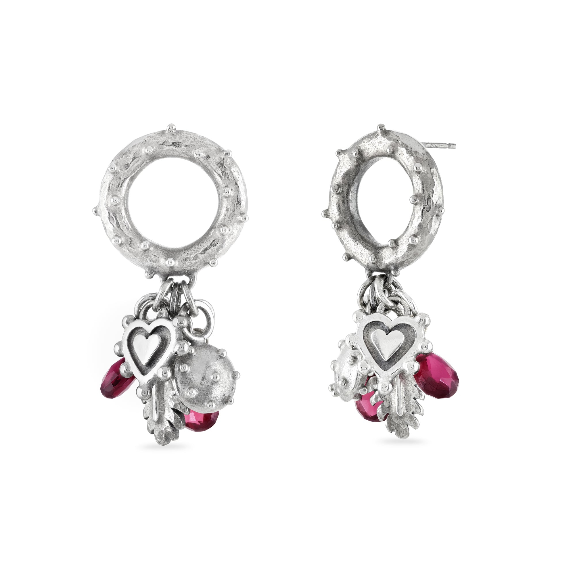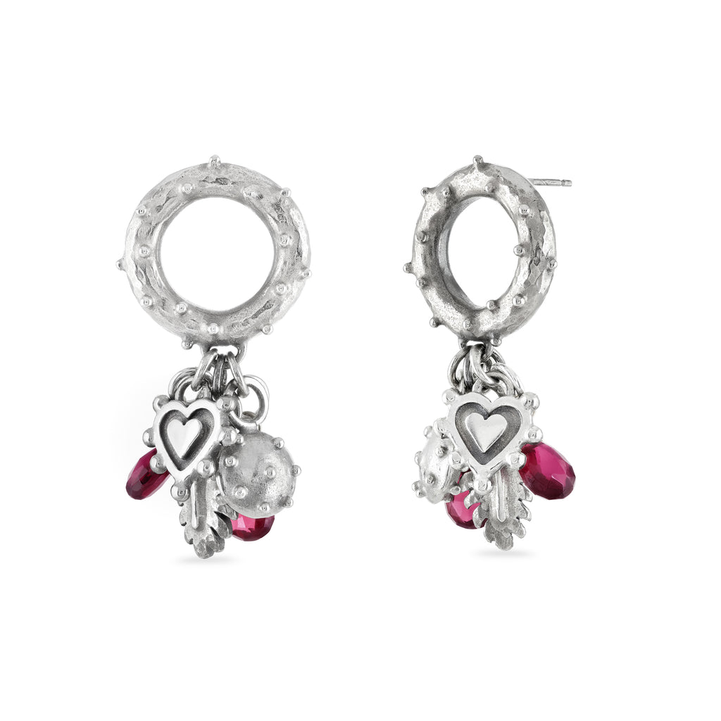 Made in sterling silver, the large, chunky circular shapes have gorgeous deep pink rhodolite garnet briolette gemstones, leaf and sacred heart drops. The overall length is 40mm and the width is 20mm.