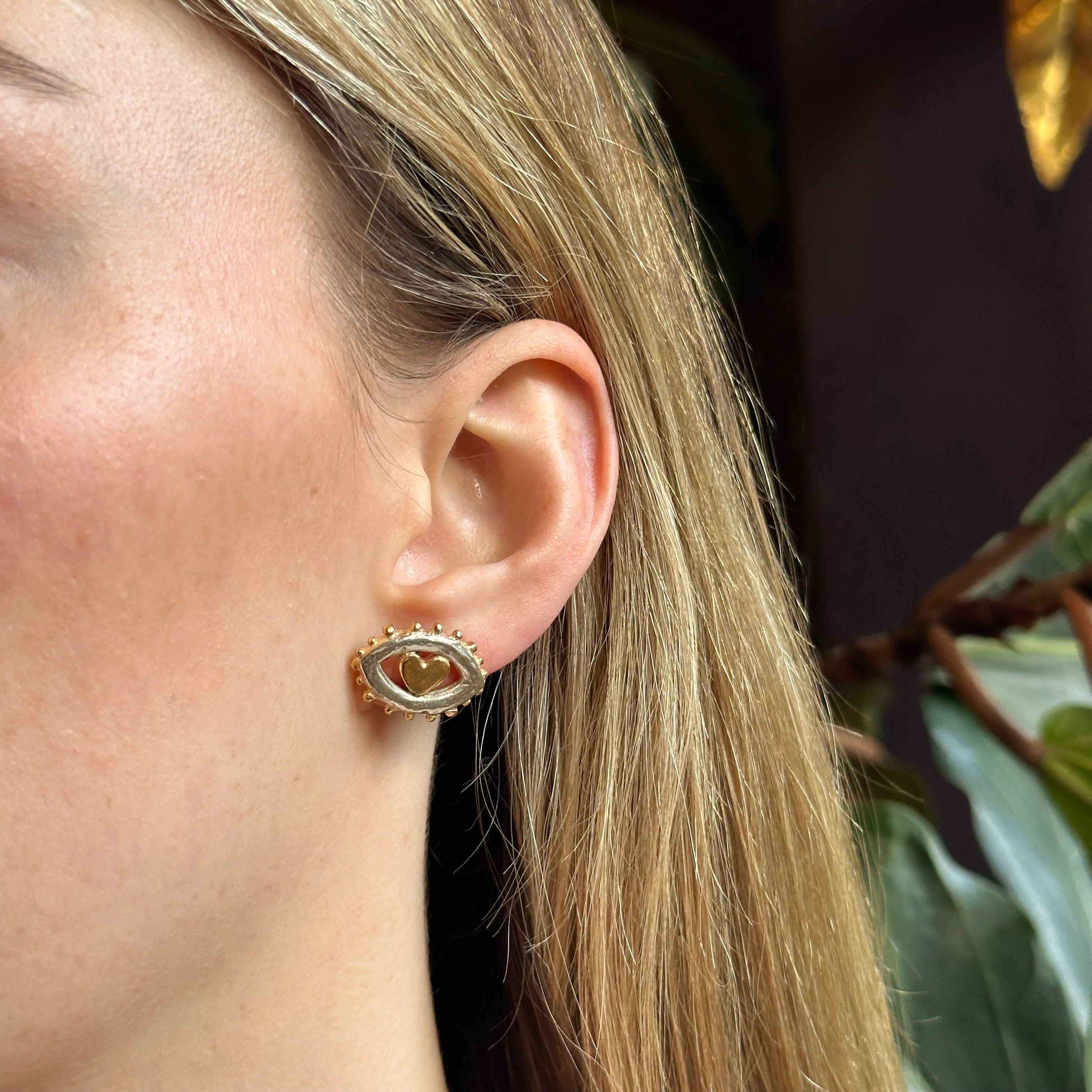 The Chunky Eye Amulet Stud Earrings symbolise protection, insight and mindful strength. With our sweet chubby hearts in the centre, they're Sophie's version of an 'evil eye.'