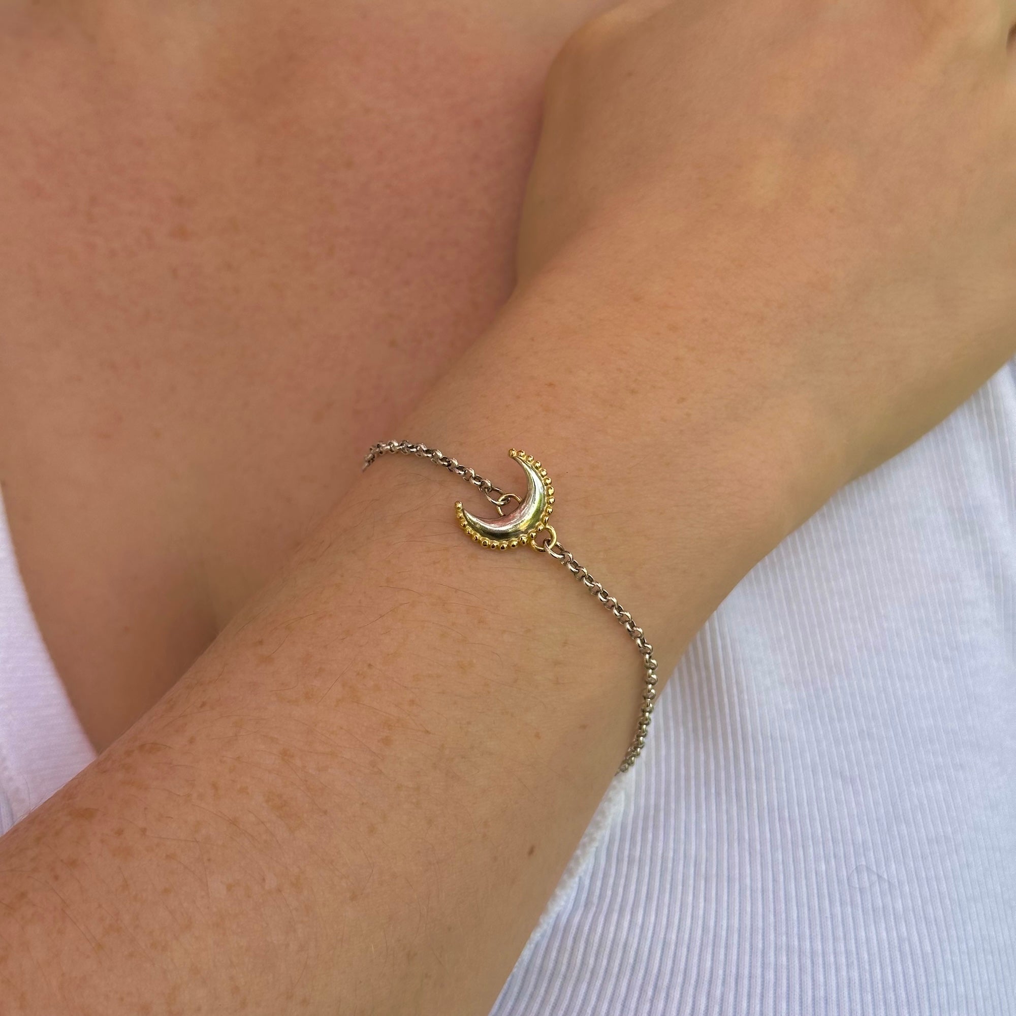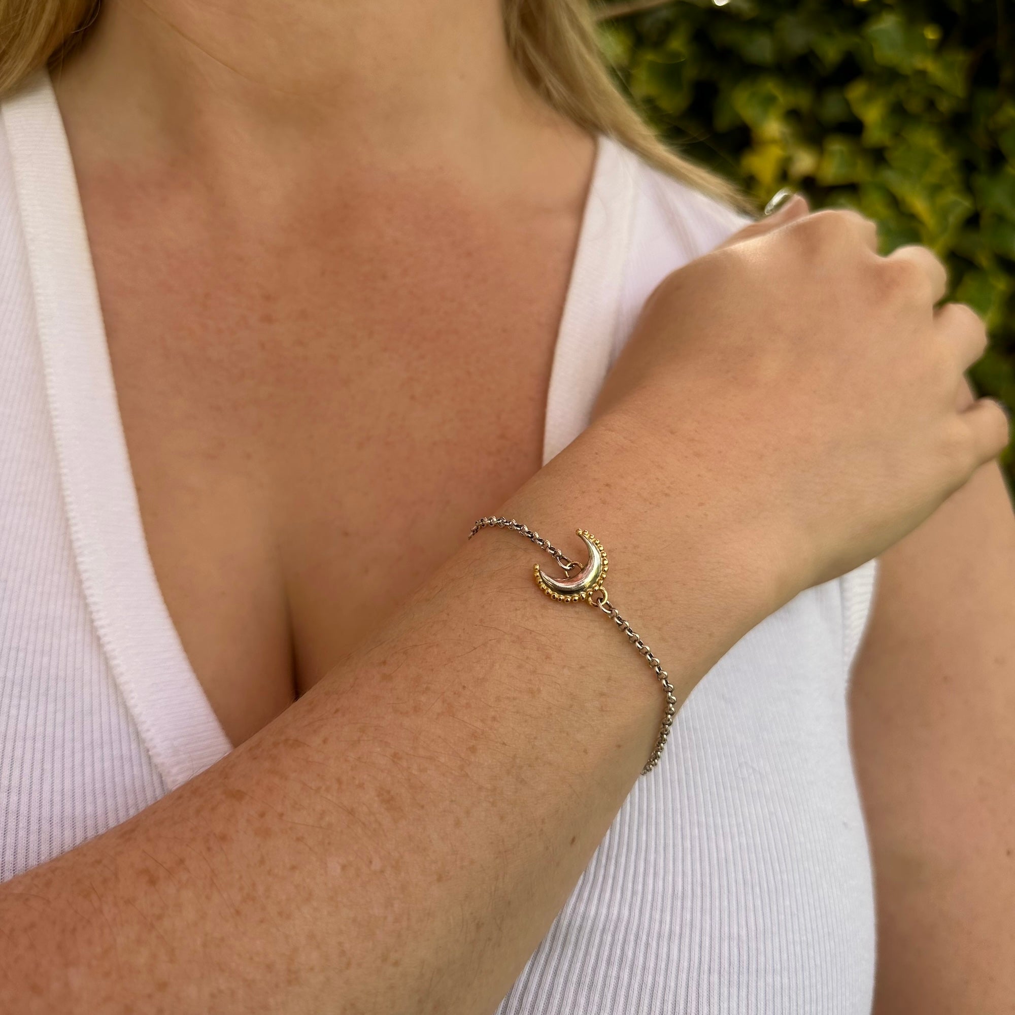 The Luna Bracelet captures the moon’s symbolism of intuition, rhythm, and feminine energy in a design that’s both meaningful and elegant, made in sterling silver with gold plated detail and a fully gold plated north star charm.