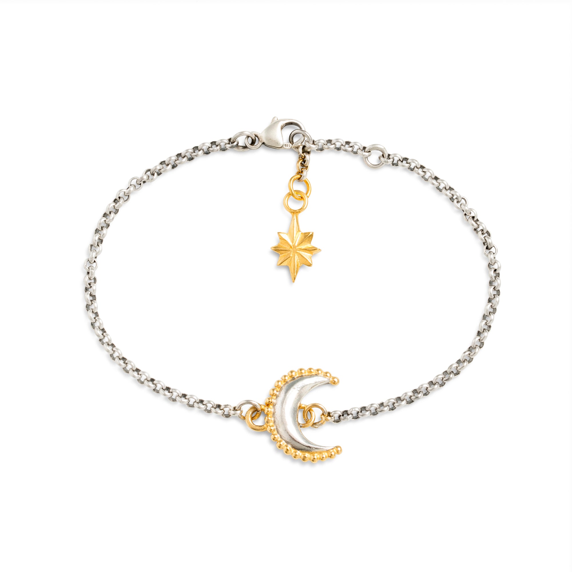 Made in sterling silver with gold plated detail on the moon and a fully gold plated north star charm at the clasp, this bracelet measures 7.5" long. The Luna charm measures 12x15mm and the chain is 2mm wide.
