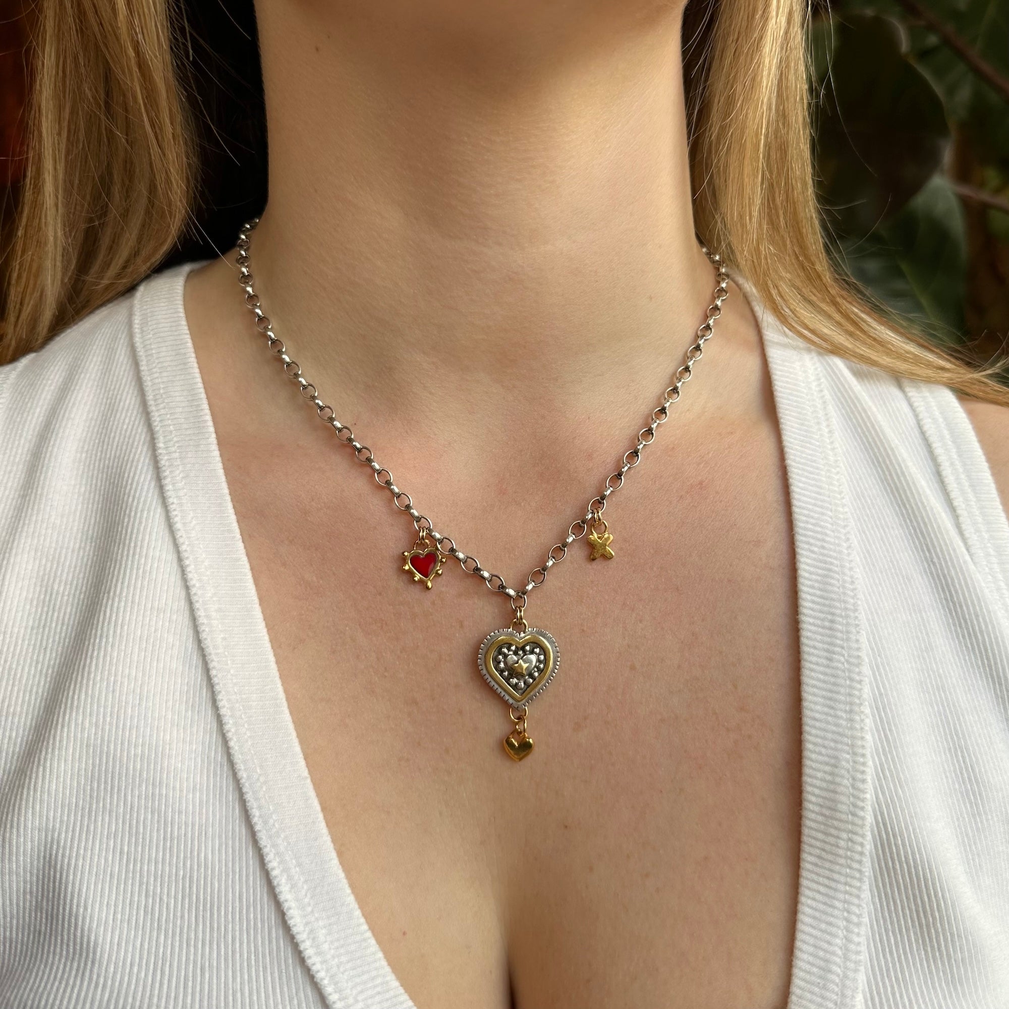 Rooted in ancient amulet traditions, this gorgeous necklace is made in sterling silver with gold plated details and a red kiln-fired enamel heart, symbolising protection, luck, and inner strength.