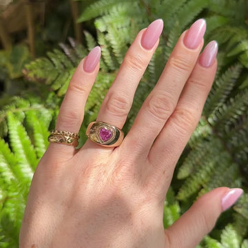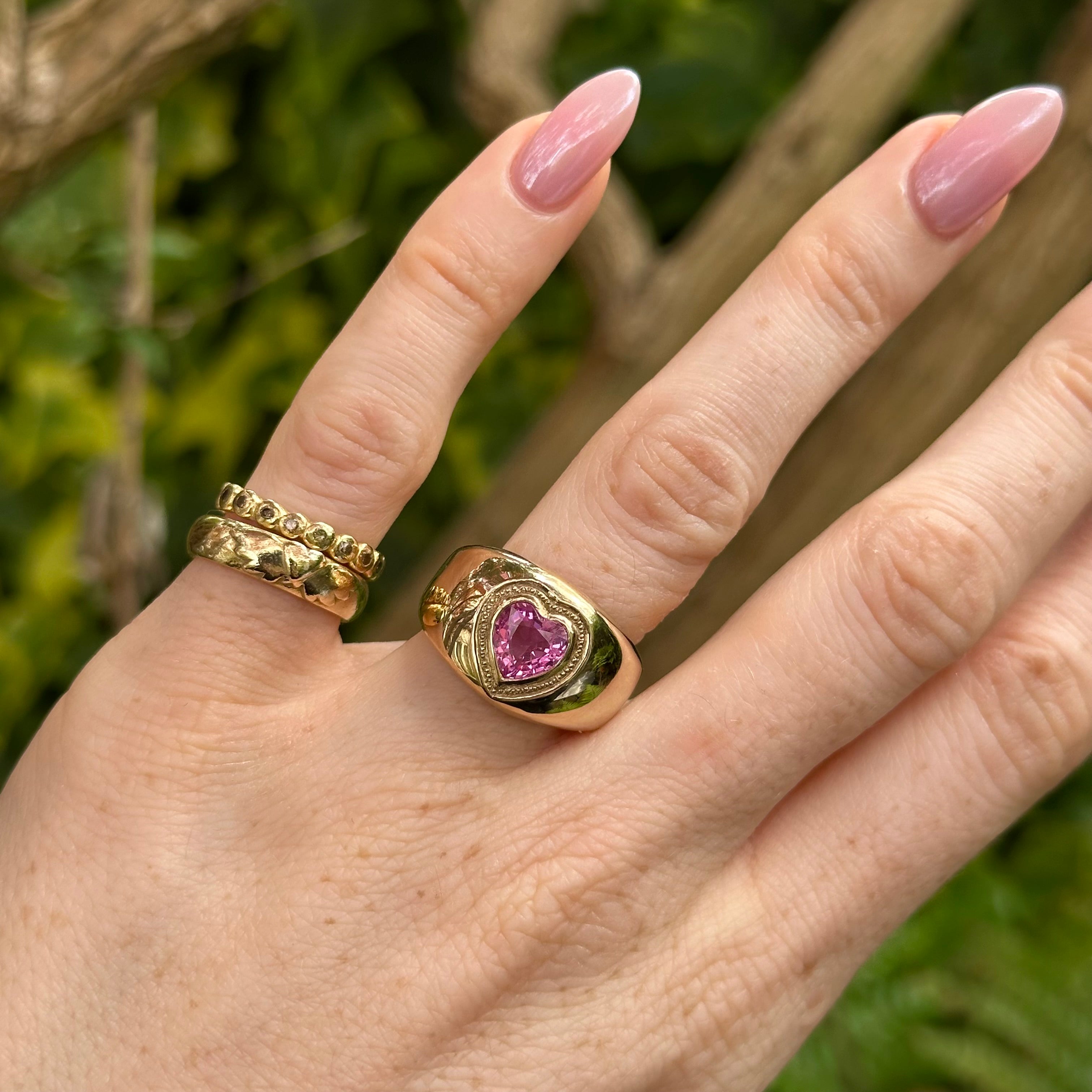 This ring features a vibrant pink heart-shaped sapphire, flush-set with delicate beaded detailing within a chunky domed bombe band, combining the sapphire’s symbolism of love, compassion, and joy with a playful yet luxurious statement design.