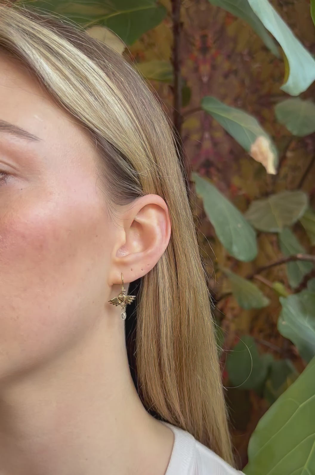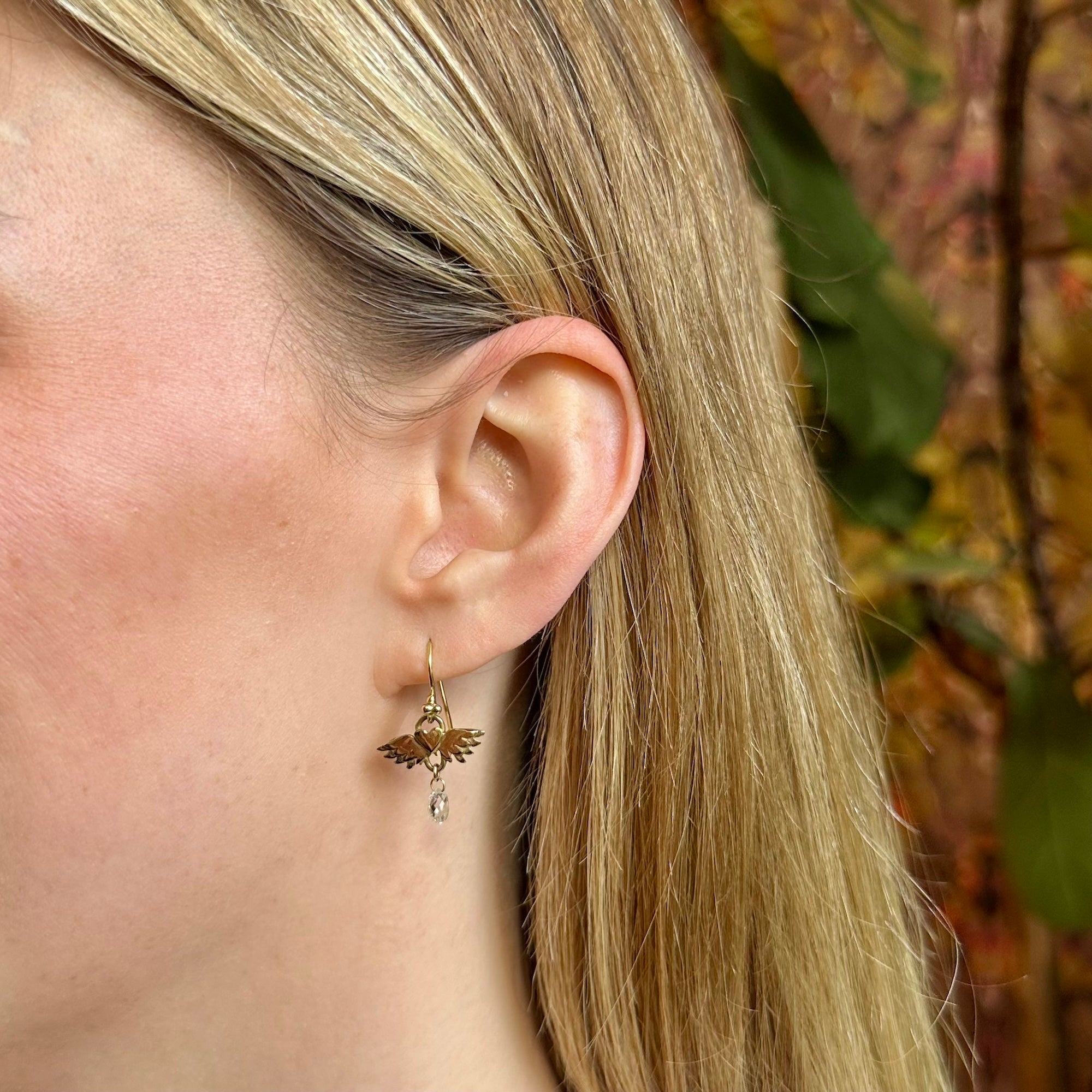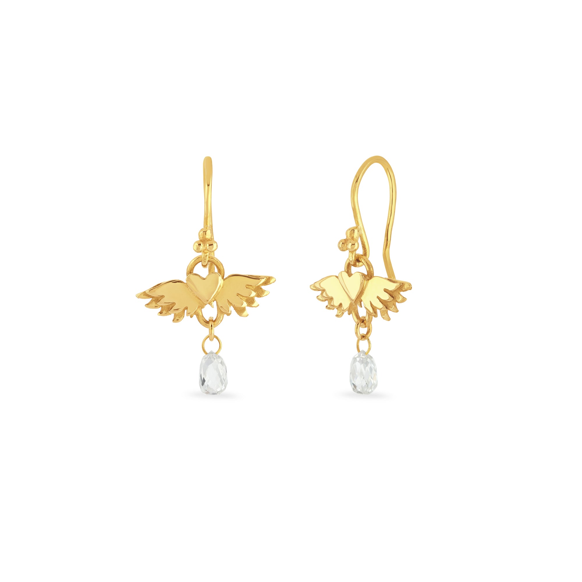 These exquisite earrings feature Sophie's signature Classic Winged Heart, symbolising love, hope and liberation. Two sparkling white .57ct briolette cut diamonds drop from the winged hearts. Each briolette is cut with multiple facets to reflect the light from all angles, to create a beautifully delicate yet utterly dazzling pair of earrings.