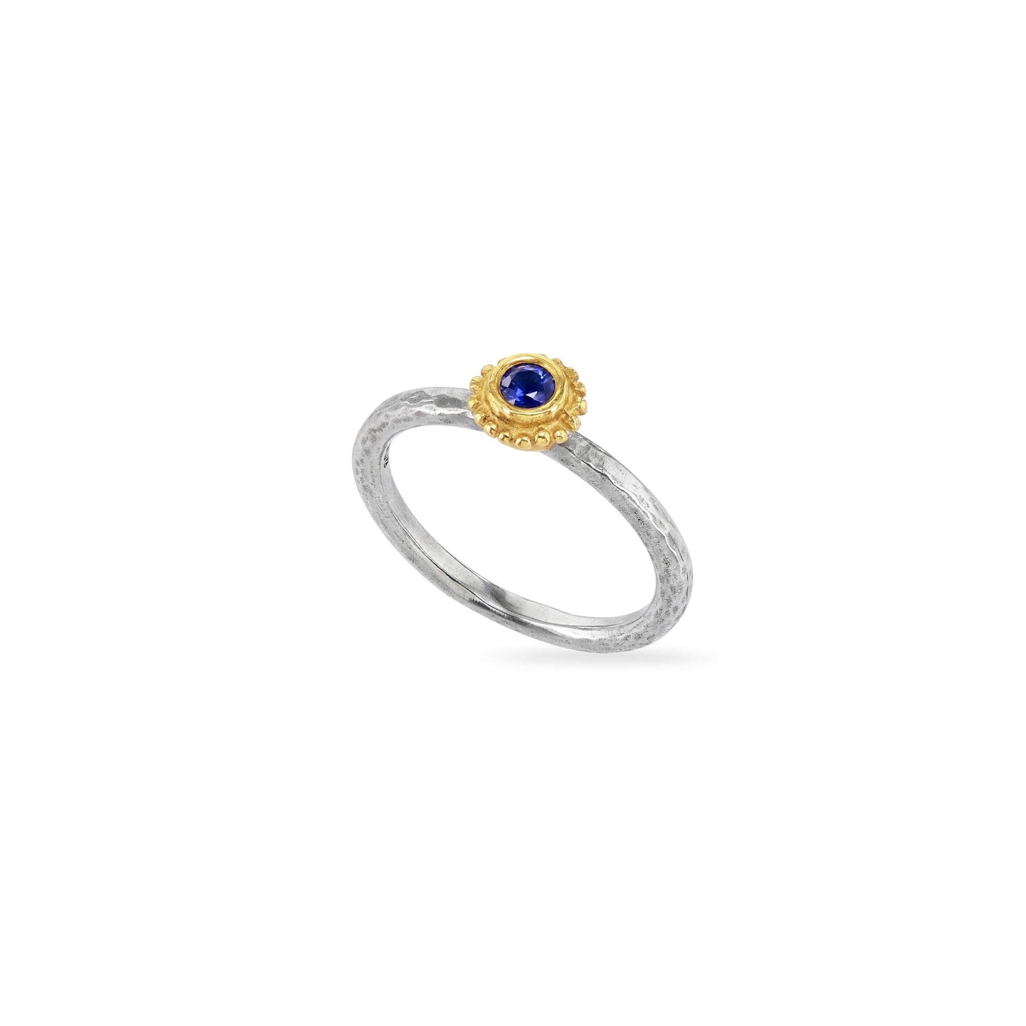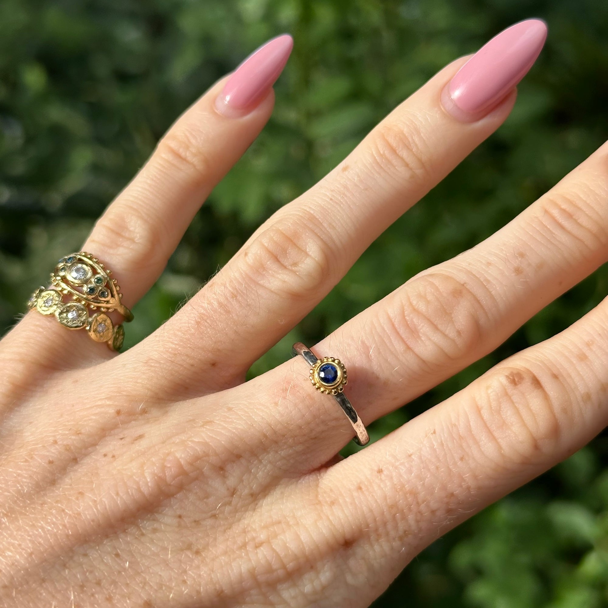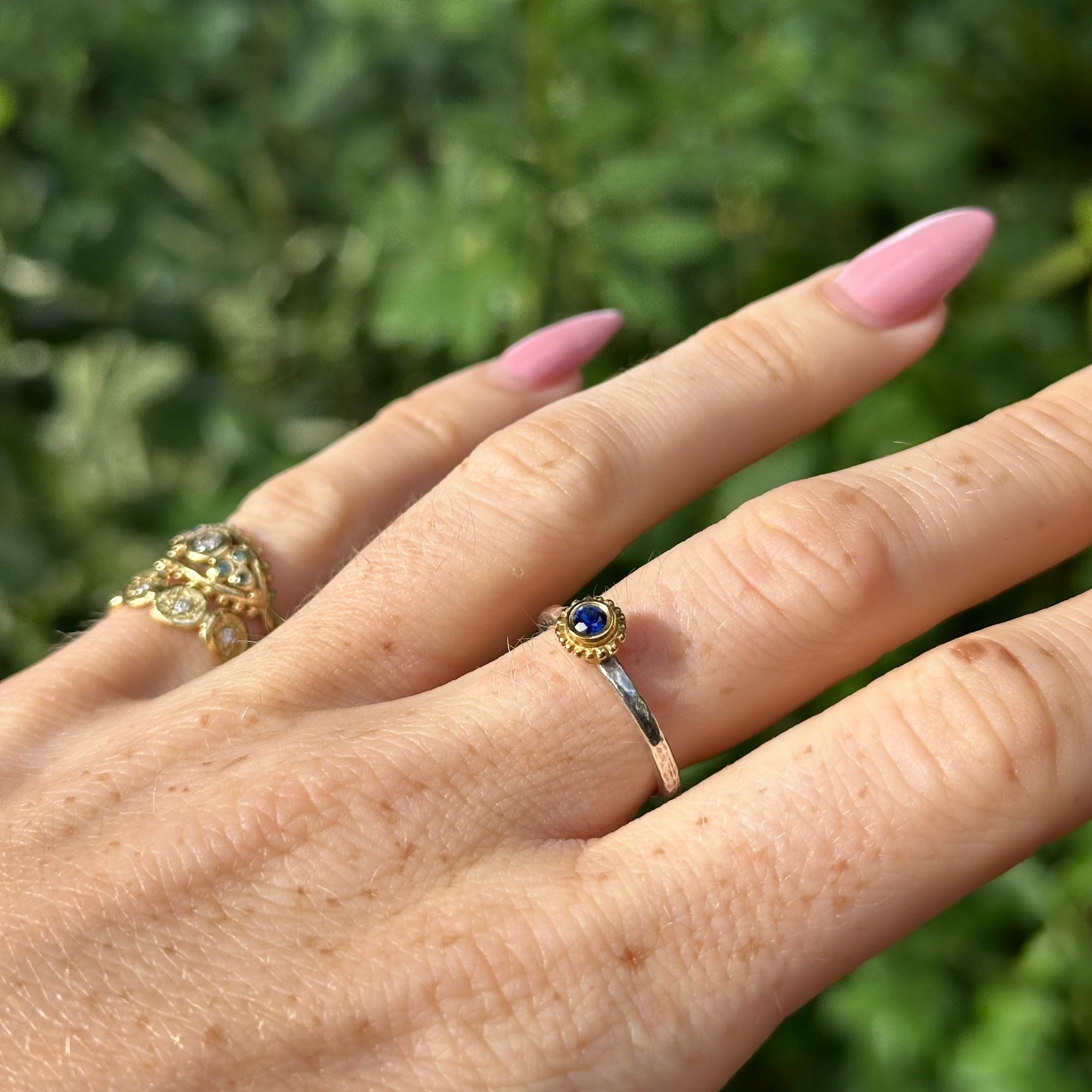 This gorgeous ring is set with a 3mm faceted blue sapphire stone. The round section sterling silver band has a gently hammered finish and is 2mm in diameter and the stone is mounted on top in a gold plated setting with delicate beaded detail.