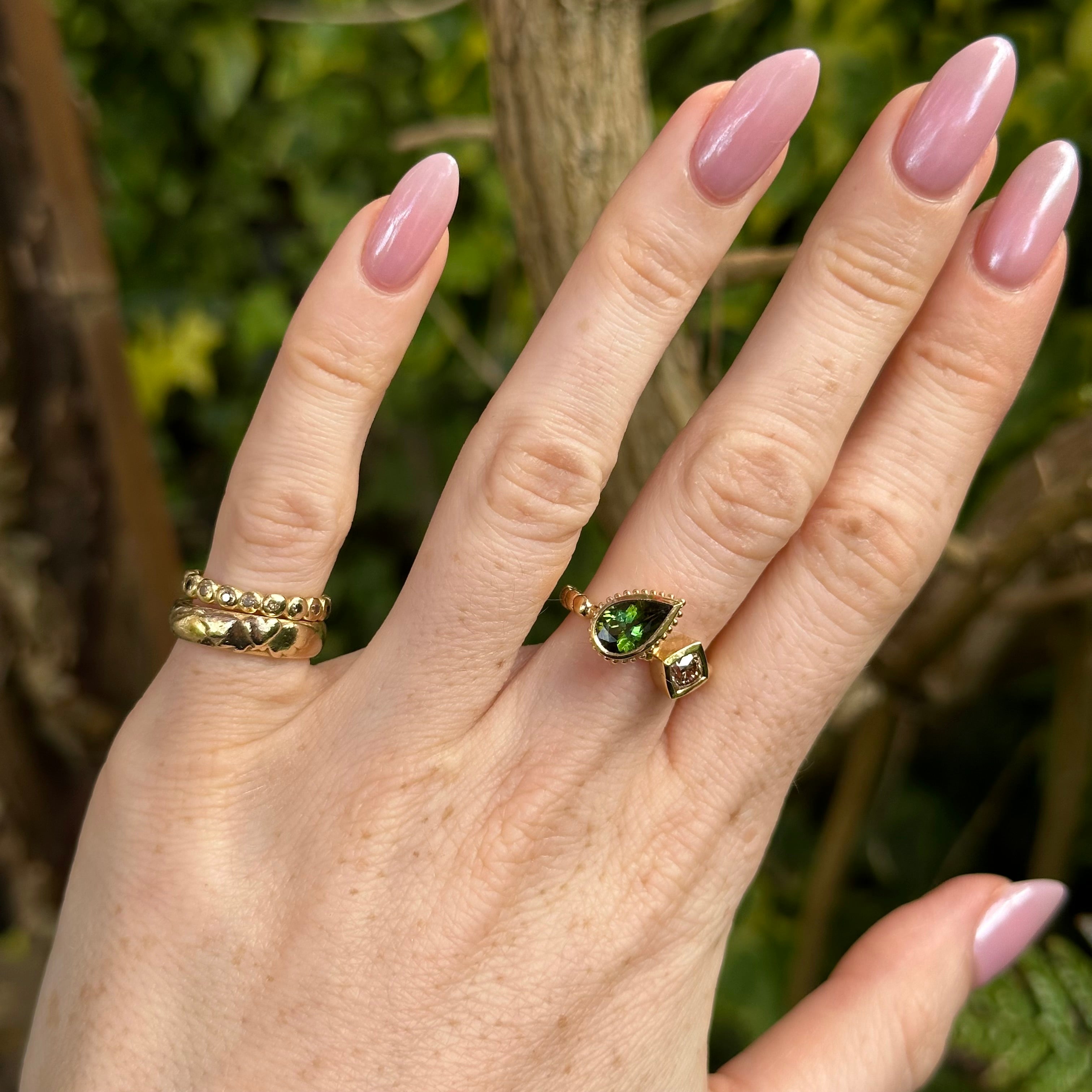 This beautiful ring is set with a stunning 9x6mm pear shaped sage green tourmaline and a gorgeous mink coloured cushion cut diamond. The stones are mounted into a 2.5mm fine pebble band made in 18ct yellow gold.