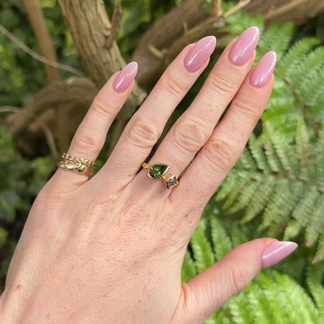 The Corazon Ring features a stunning deep green pear tourmaline in our signature finely beaded setting, next to a sparkling cushion cut mink coloured diamond, to create this "toi et moi" style ring. The combination of green tourmaline and diamond symbolises healing, growth, and vitality, paired with strength, clarity, and enduring love, creating a piece that blends vibrant energy with timeless elegance.