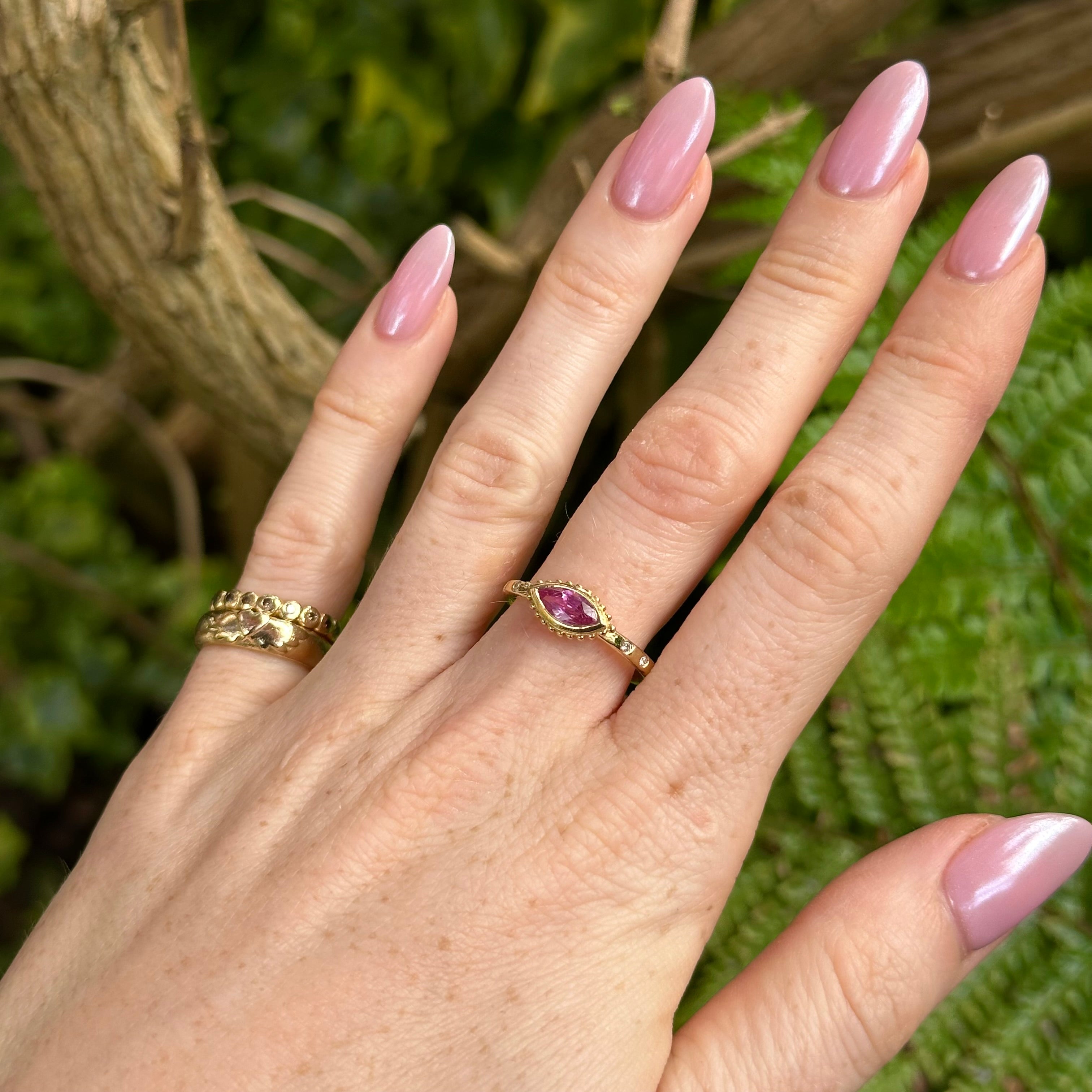 This romantic ring features a luminous marquise cut Pink Sapphire in our signature finely beaded setting, with sparkling white diamonds set into the gently hammered band, symbolising compassion, emotional healing, and gentle strength, made in 18ct yellow gold.