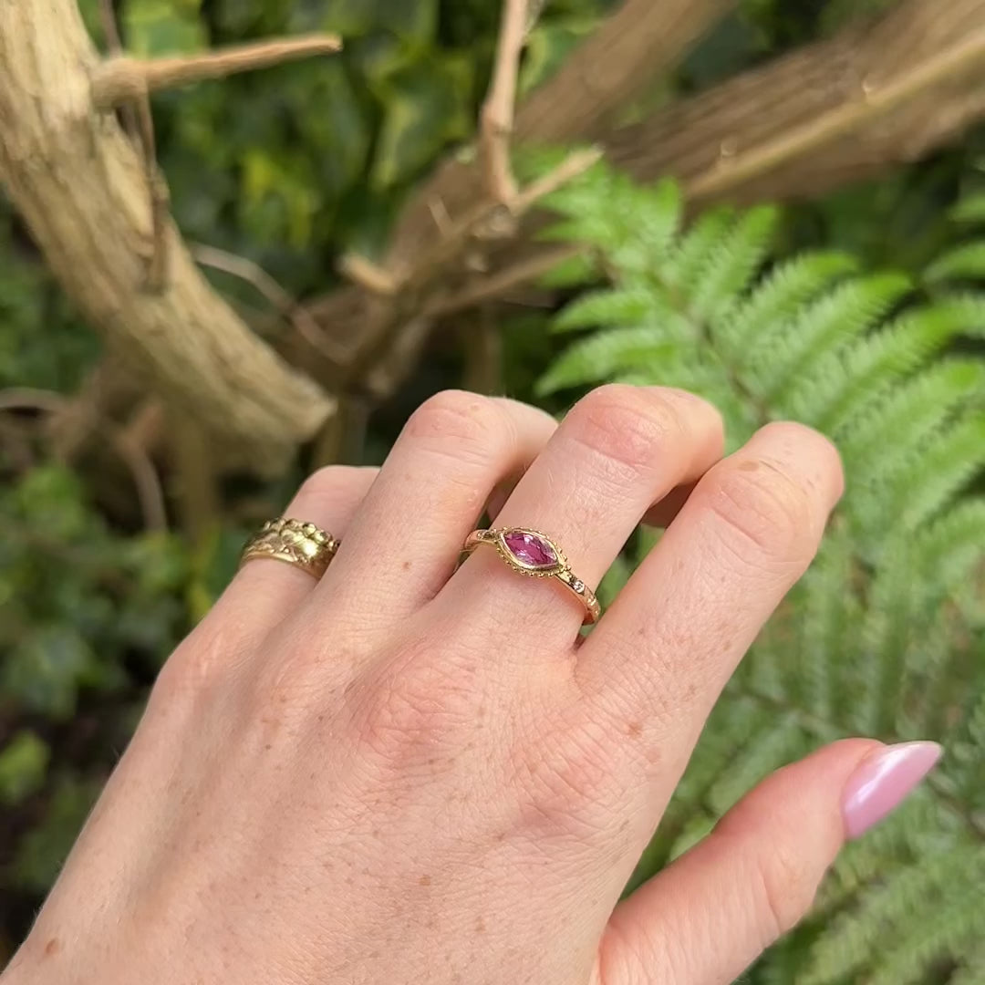 This adorable 18ct yellow gold ring is set with a marquise cut pink sapphire and 6 little white diamonds. The width of the gently hammered band is 2mm and the central setting with beaded detail is 11x6mm.