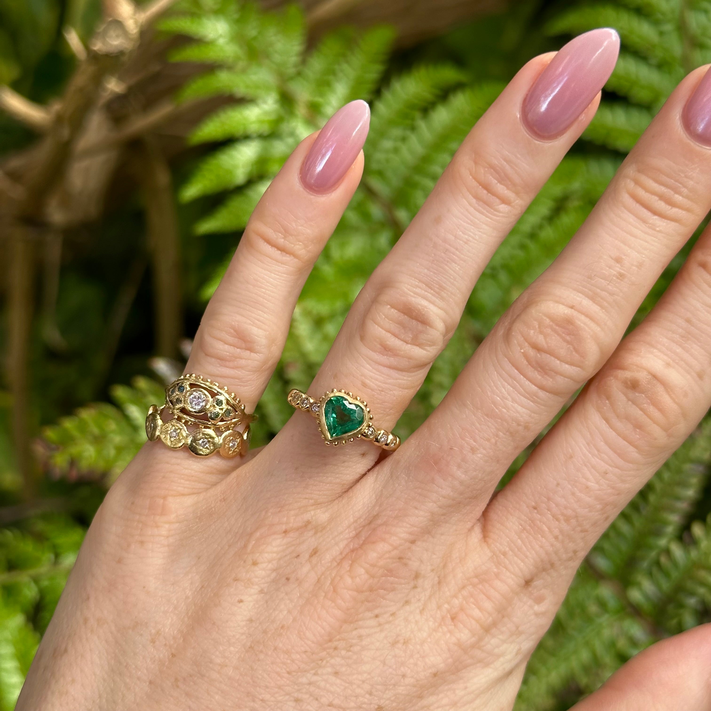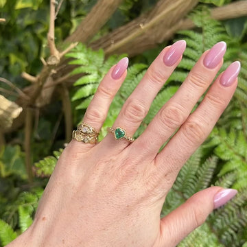 The Esme ring features a vibrant heart shaped emerald set in our signature finely beaded setting, with three sparkling white diamonds set either side into our pebble band, to create a classic Sophie Harley piece. Emeralds symbolise healing, growth, and balance, making this a special piece that combines vibrant colour with timeless elegance.