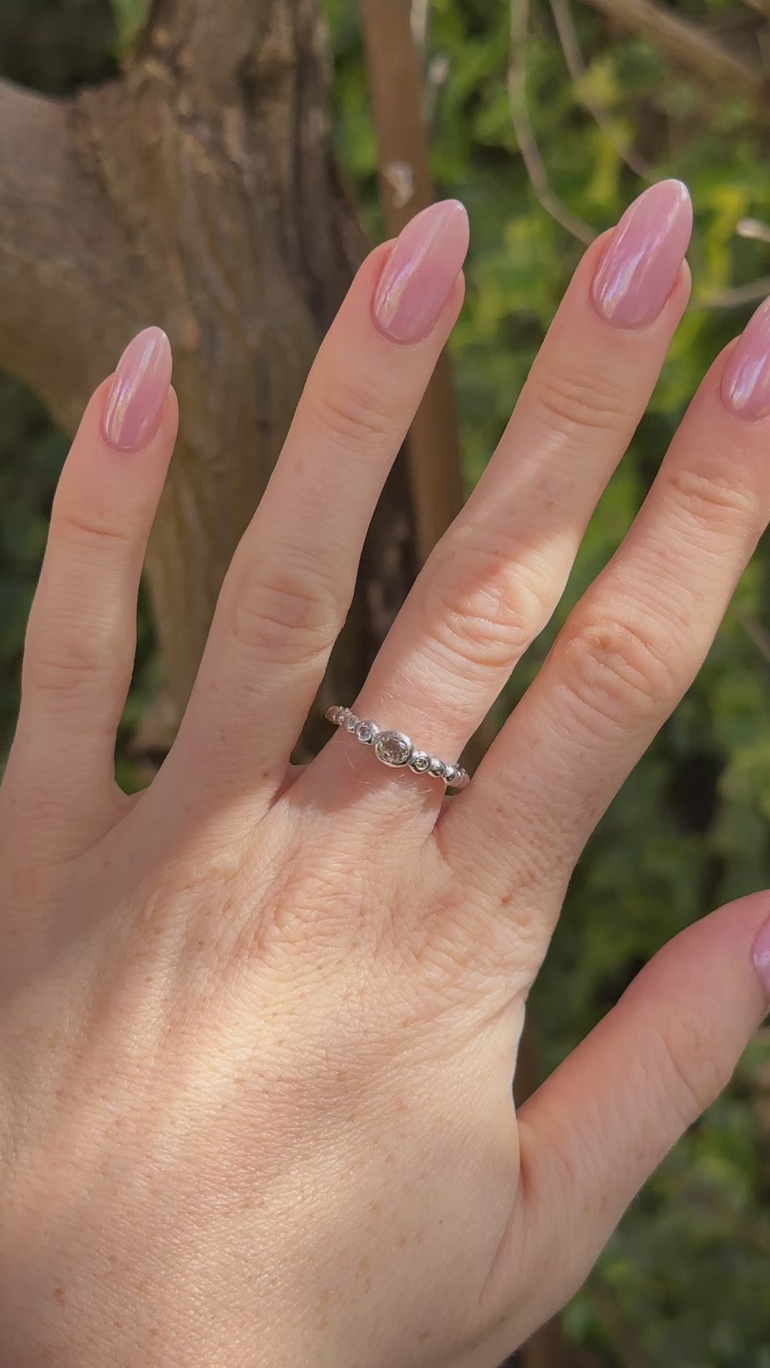 This ring is set with a beautiful 0.23ct old cut oval mink coloured diamond in the centre with little paler mink coloured diamonds on each side. The 3mm "Skinny Pebble" band and settings are made in 18ct white gold.