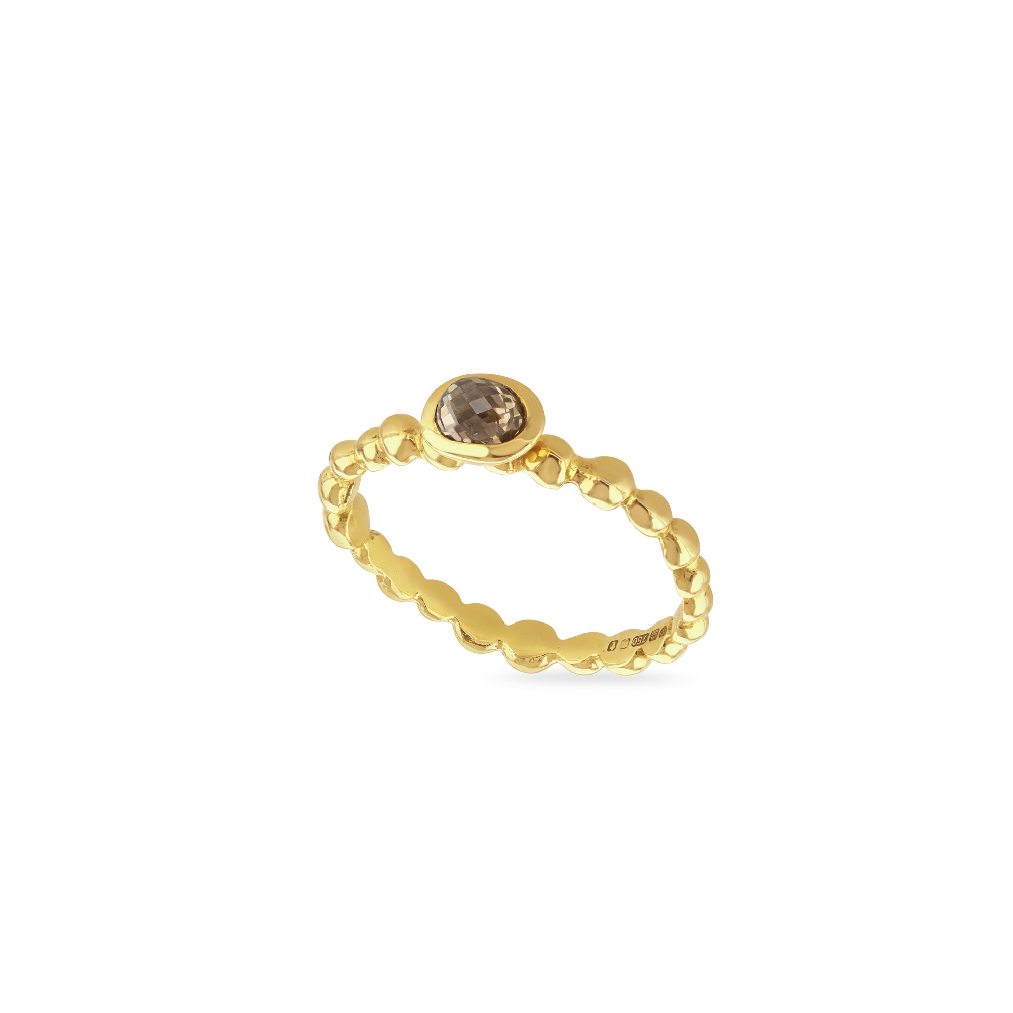 Made in 18ct yellow gold, the brown briolette cut diamond measures 5x4mm and the pebble cut band is approximately 2mm wide. Please contact us if you would like this ring re-sized.