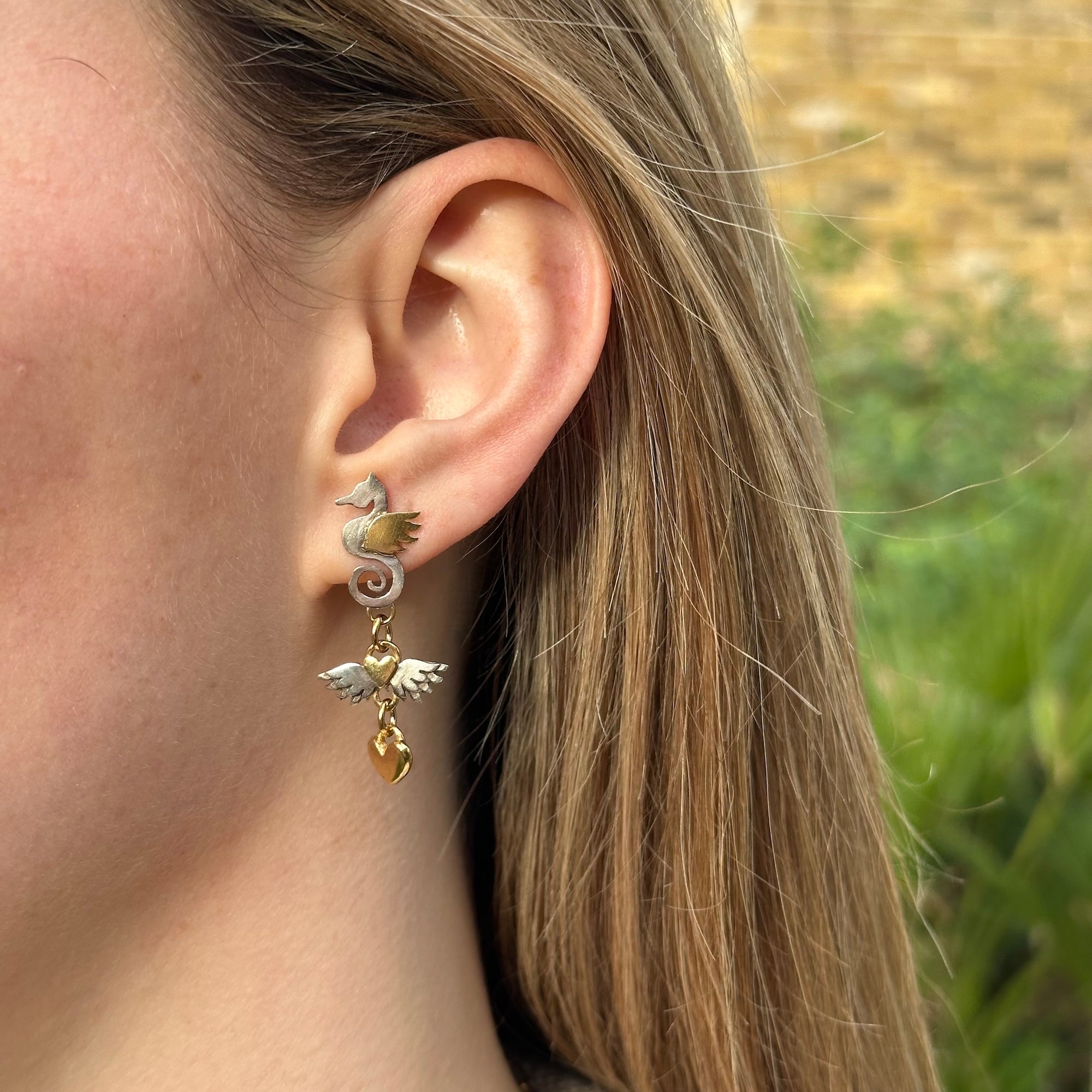The Delphin Earrings feature Sophie's iconic winged heart and seahorse — symbols of strength, freedom, hope, and love.