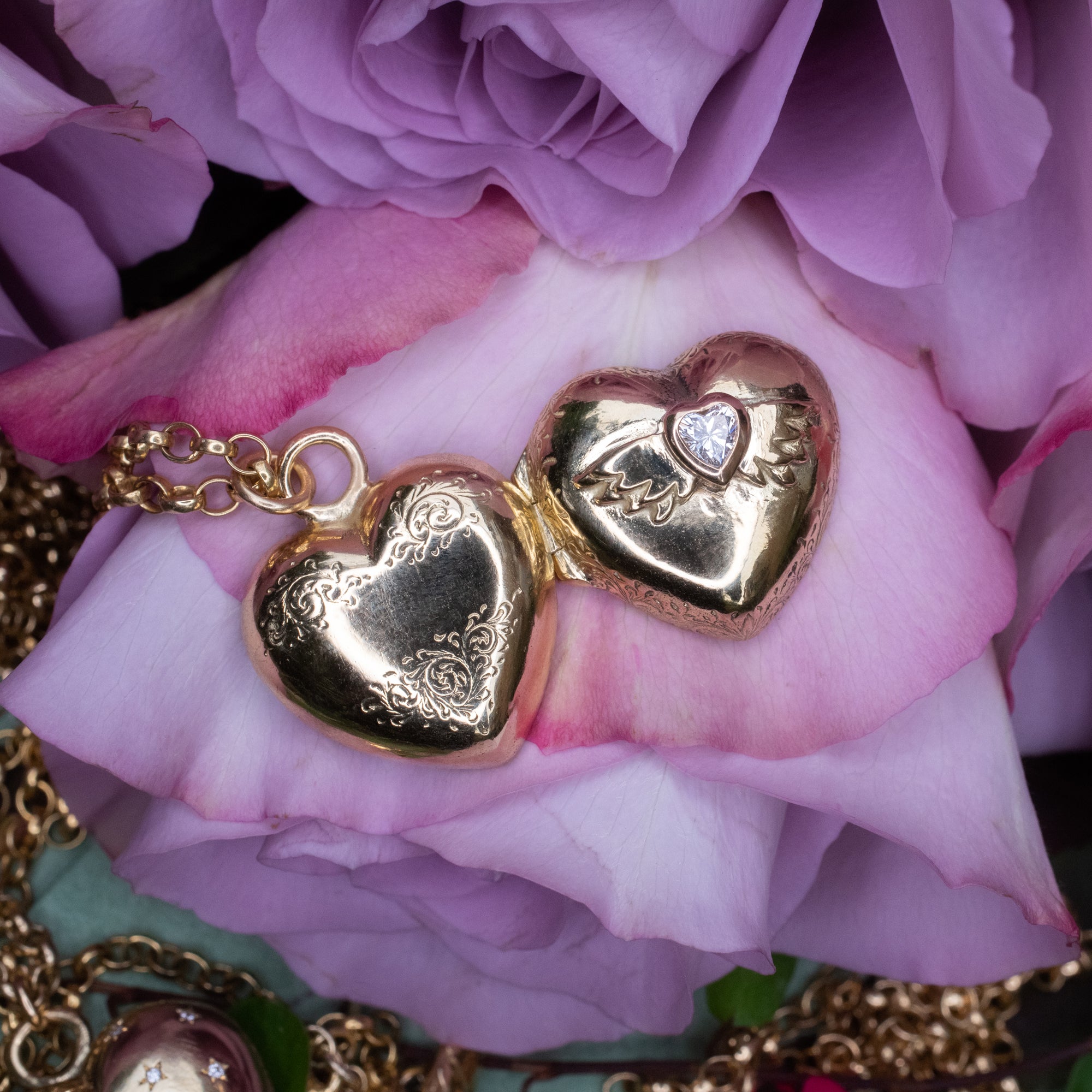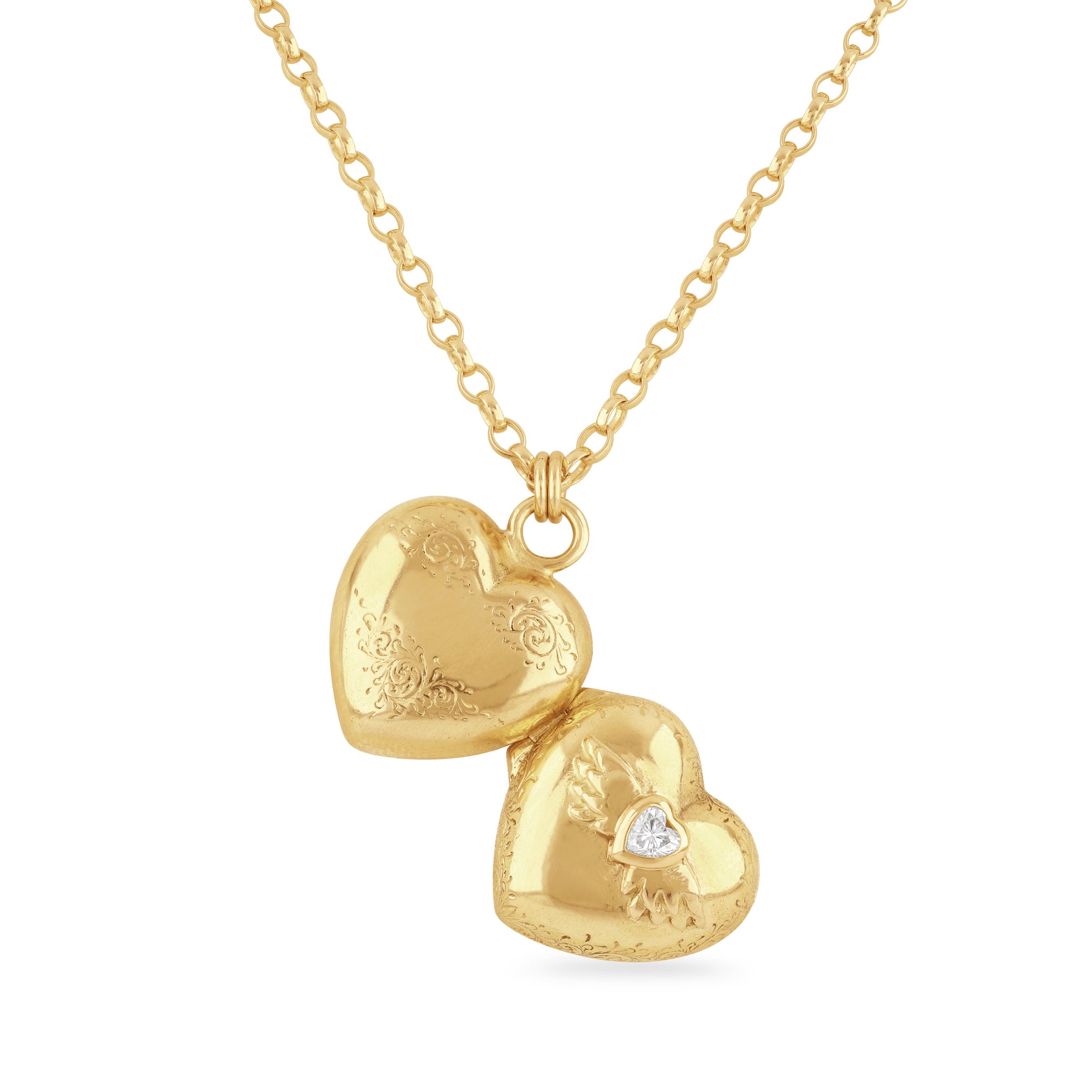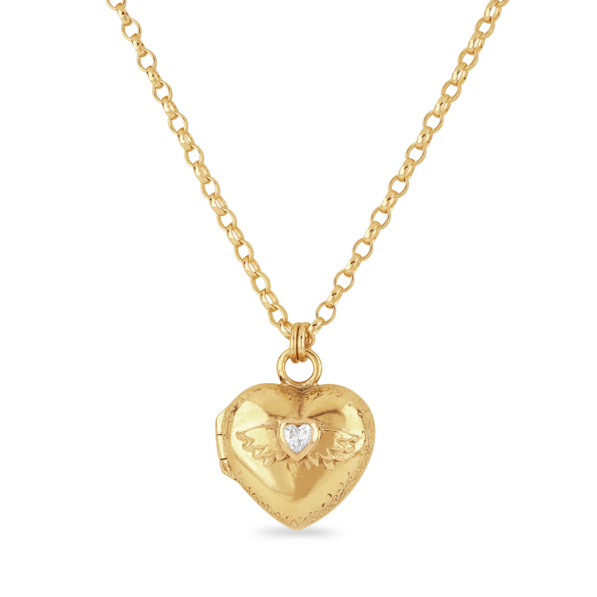 A precious symbol of love, hope and liberation, this gorgeous locket is made in 18ct yellow gold and set with a glittering heart shaped white diamond.