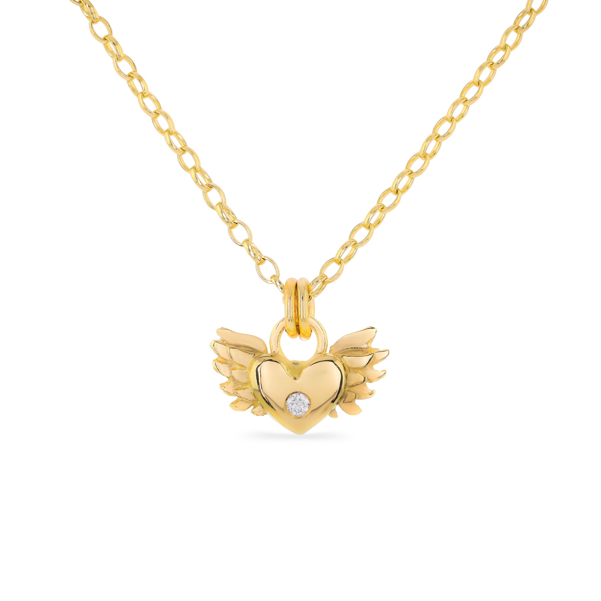 Made in 18ct yellow gold and set with a 2mm white diamond. The fine oval link chain is 1.8mm wide, with a carabiner and heart detail clasp. The charm is 15x10mm in diameter.