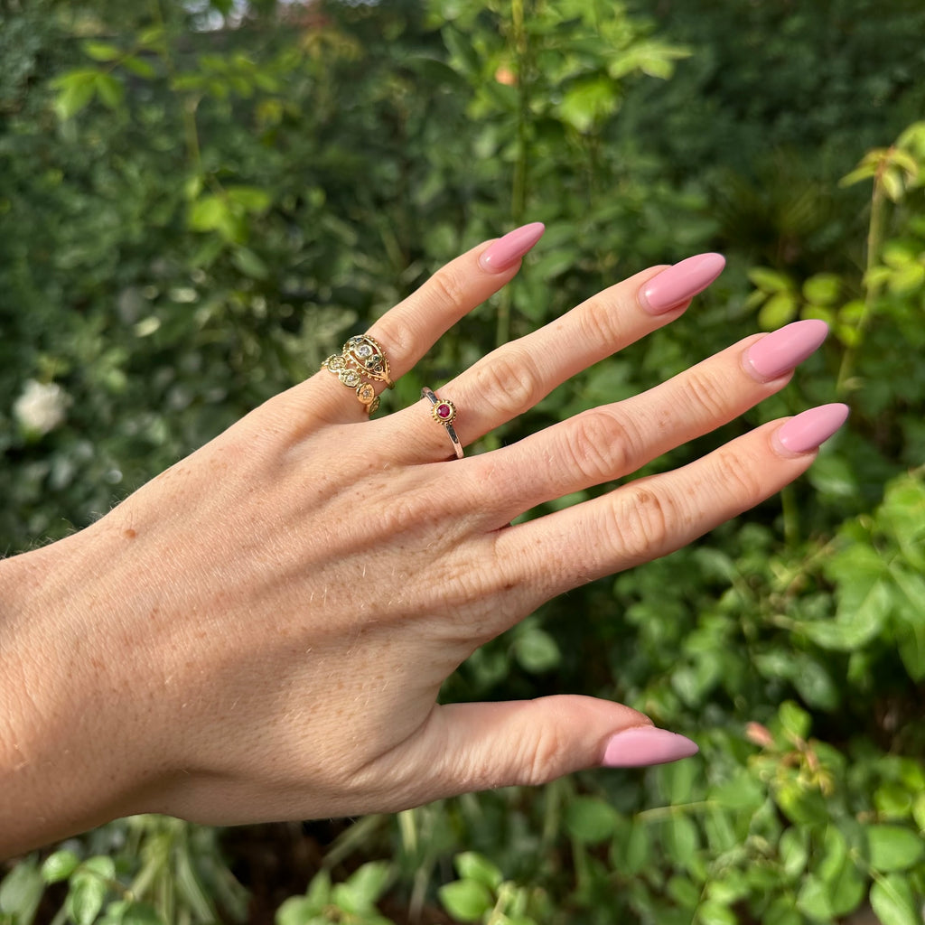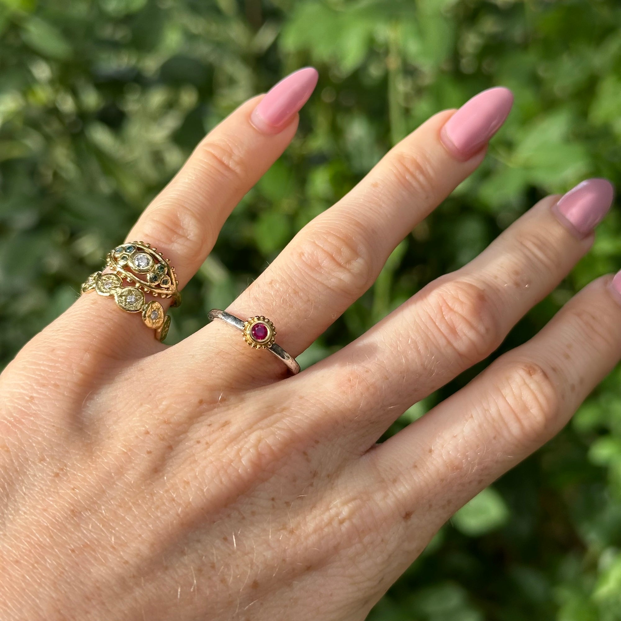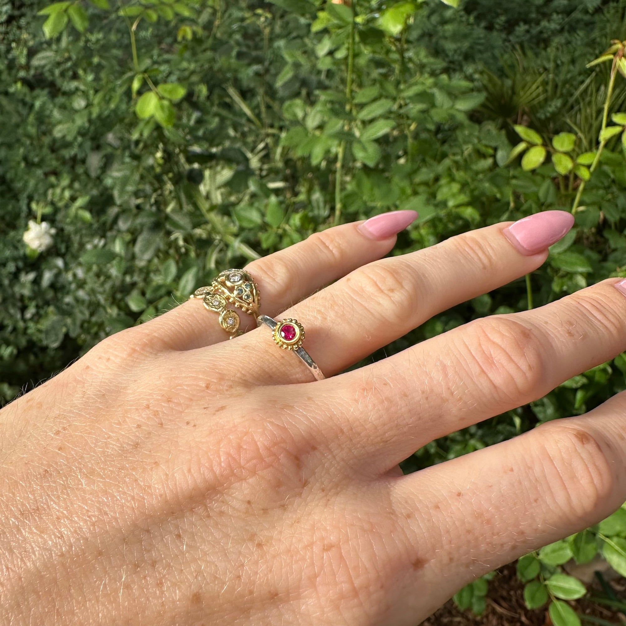 This beautiful and classic ring is set with a 3mm vibrant faceted red Ruby stone. The round section sterling silver band has a gently hammered finish and is 2mm in diameter and the stone is mounted on top in a gold plated setting with delicate beaded detail.