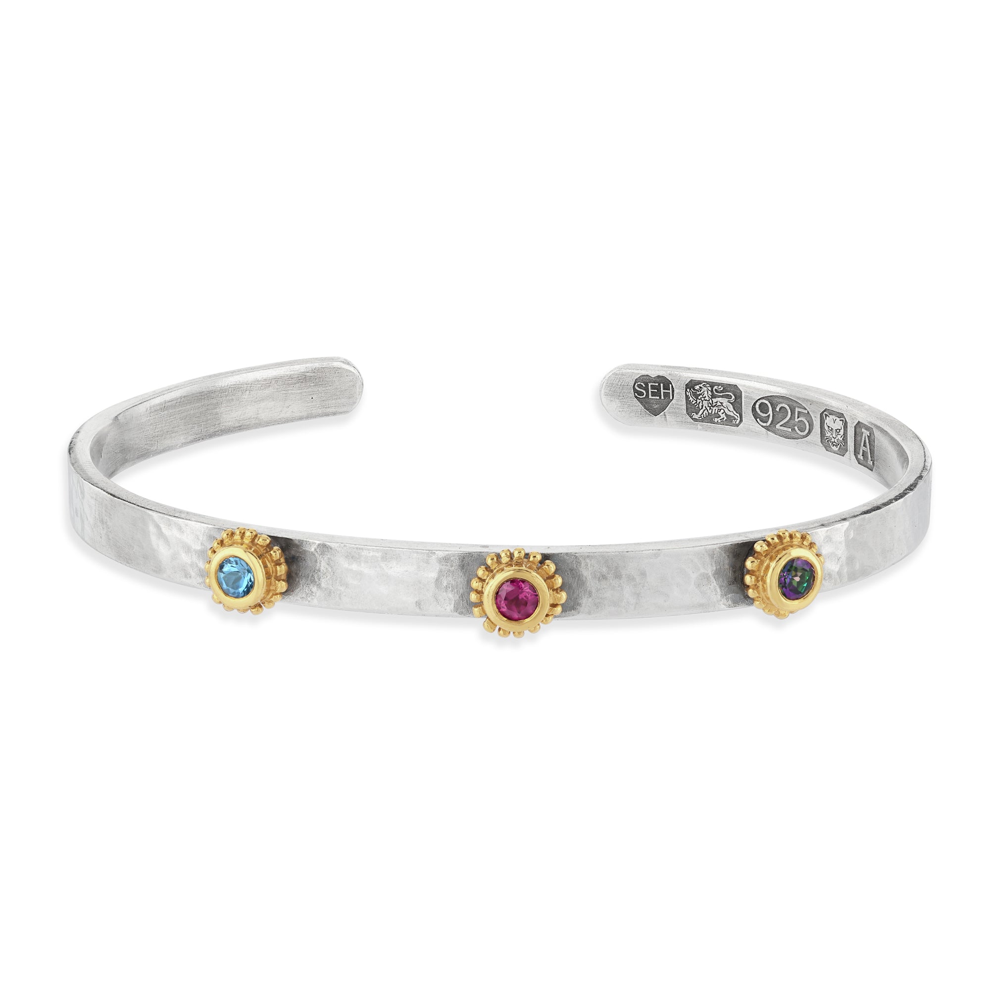 With sparkling pops of colour, this vibrant cuff is made in sterling silver with 18ct gold plated detail and set with 3 beautiful gemstones - aquamarine brings calmness and clarity, rhodolite garnet, passion and balance and mystic topaz stimulates, and recharges.