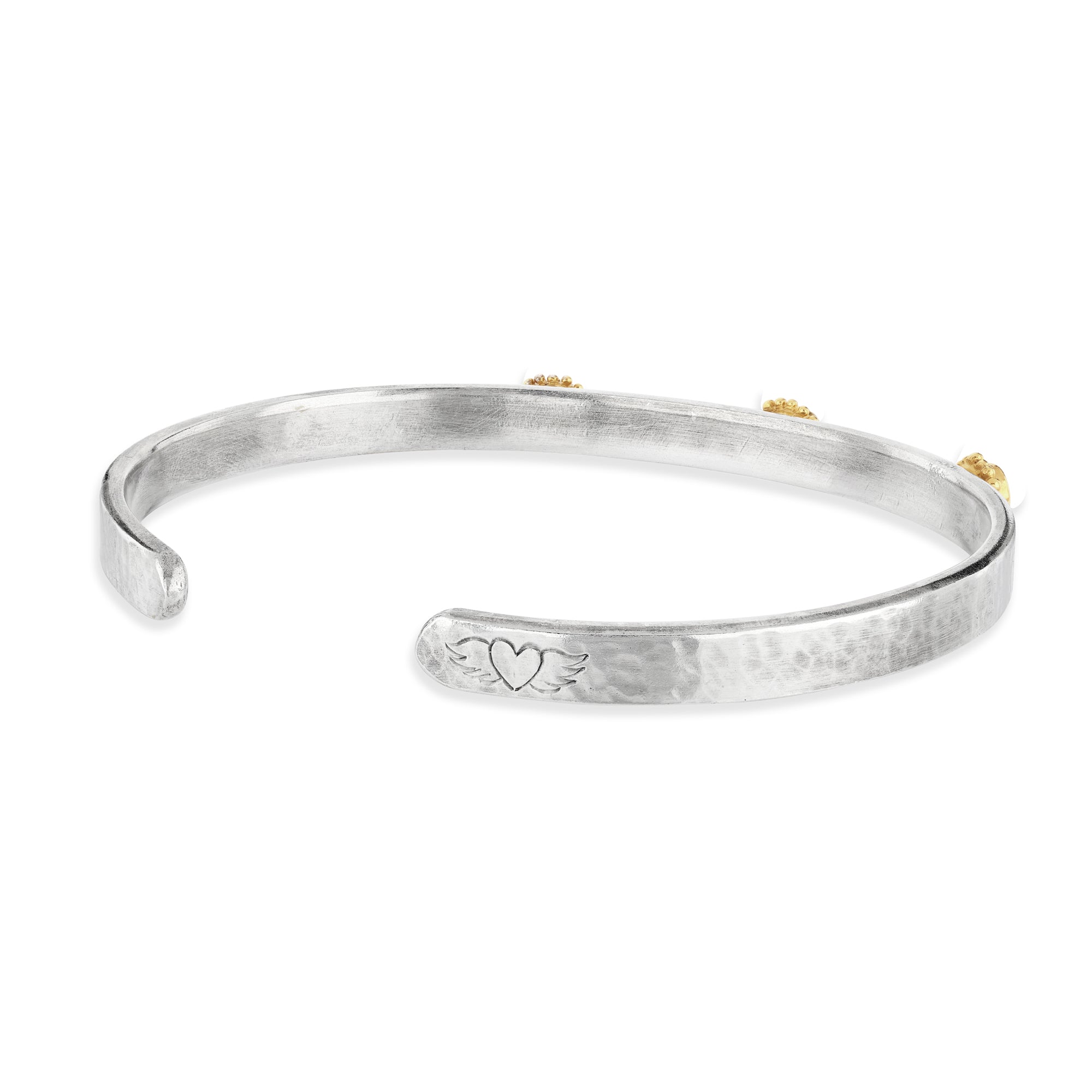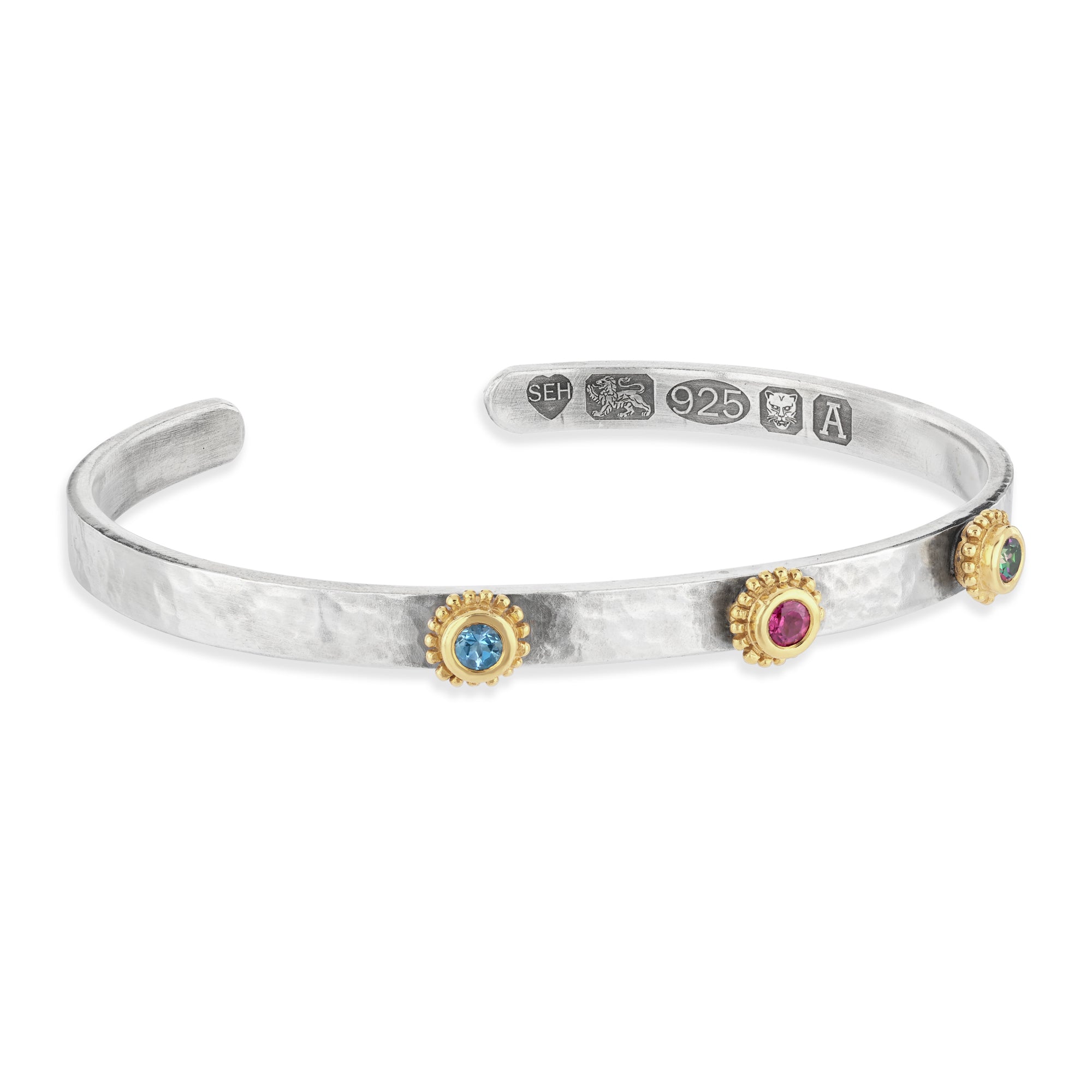 Made in sterling silver with 18ct gold plated detail, the cuff is 5mm wide with a gently hammered surface finish. Each gemstone is 3mm in diameter.