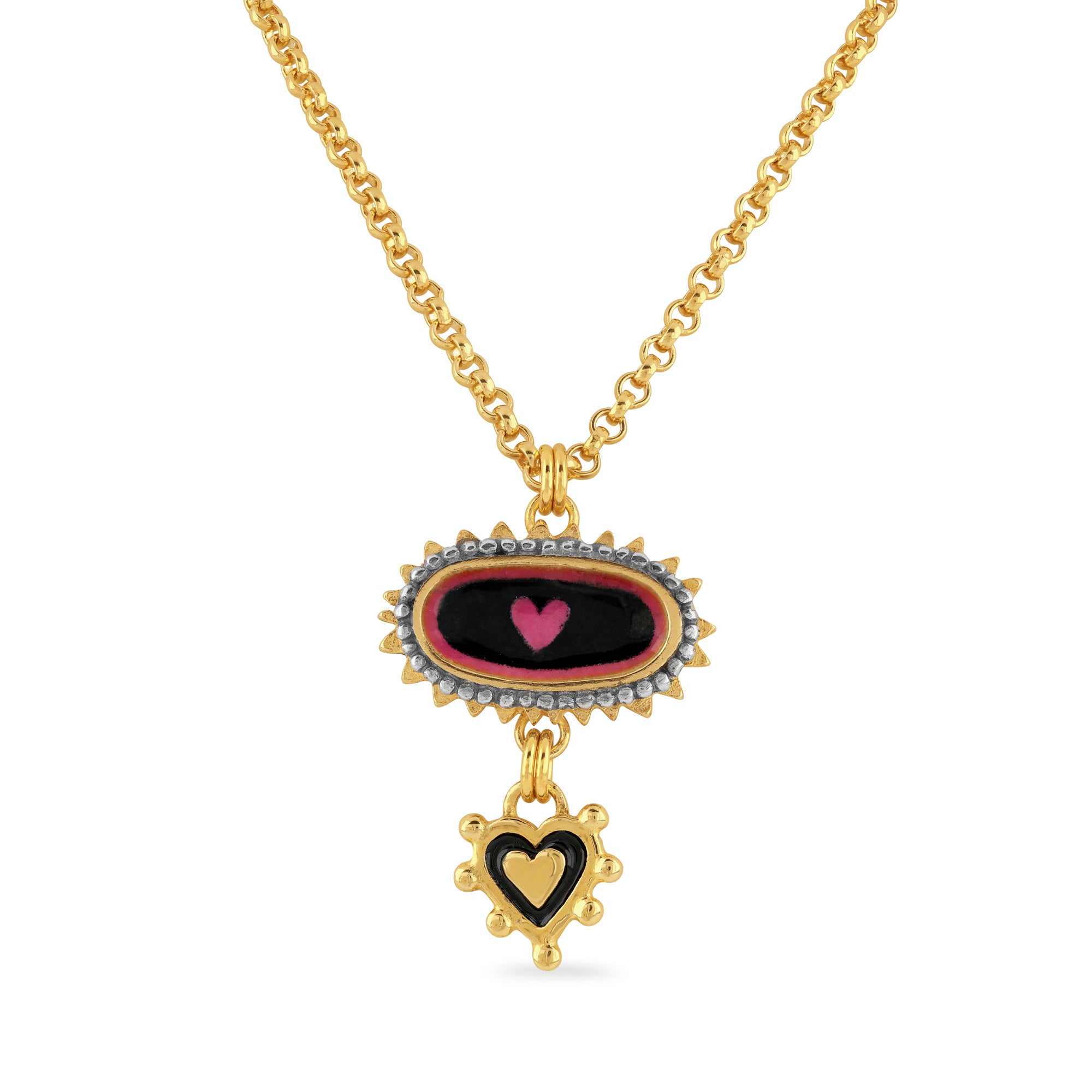 This stunning amulet, with exquisite pink and black enamelled detail, is made in sterling silver with 18ct gold plating and kiln fired glass enamel.