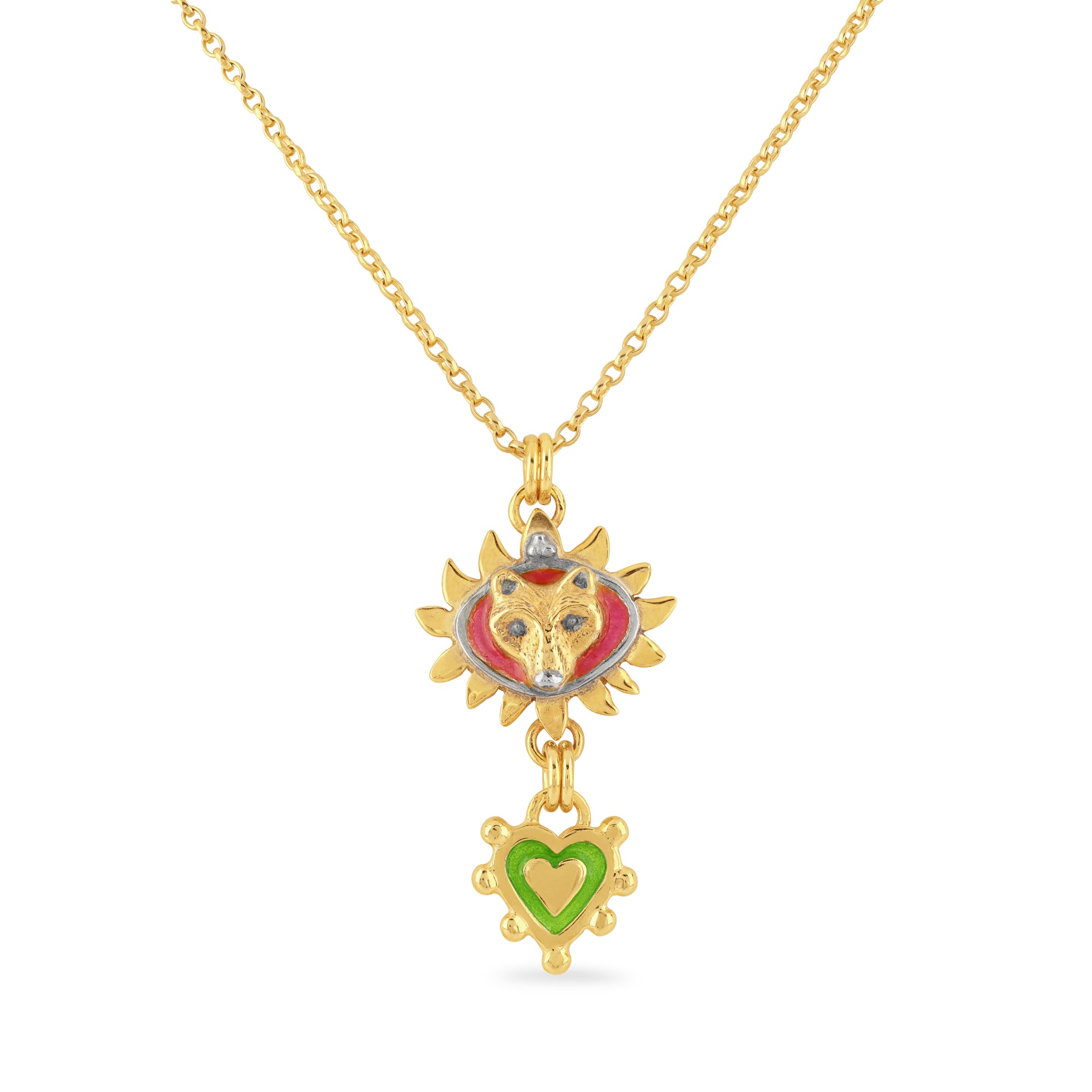 This gorgeous, colourful necklace is one of many special Limited Edition pieces in the collection. The intricate Layered Wolf Flame charm has Flamingo Pink translucent kiln fired enamel surrounding the wolf head with a Sacred Heart drop with Citrus Green kiln fired vitreous enamel detail.