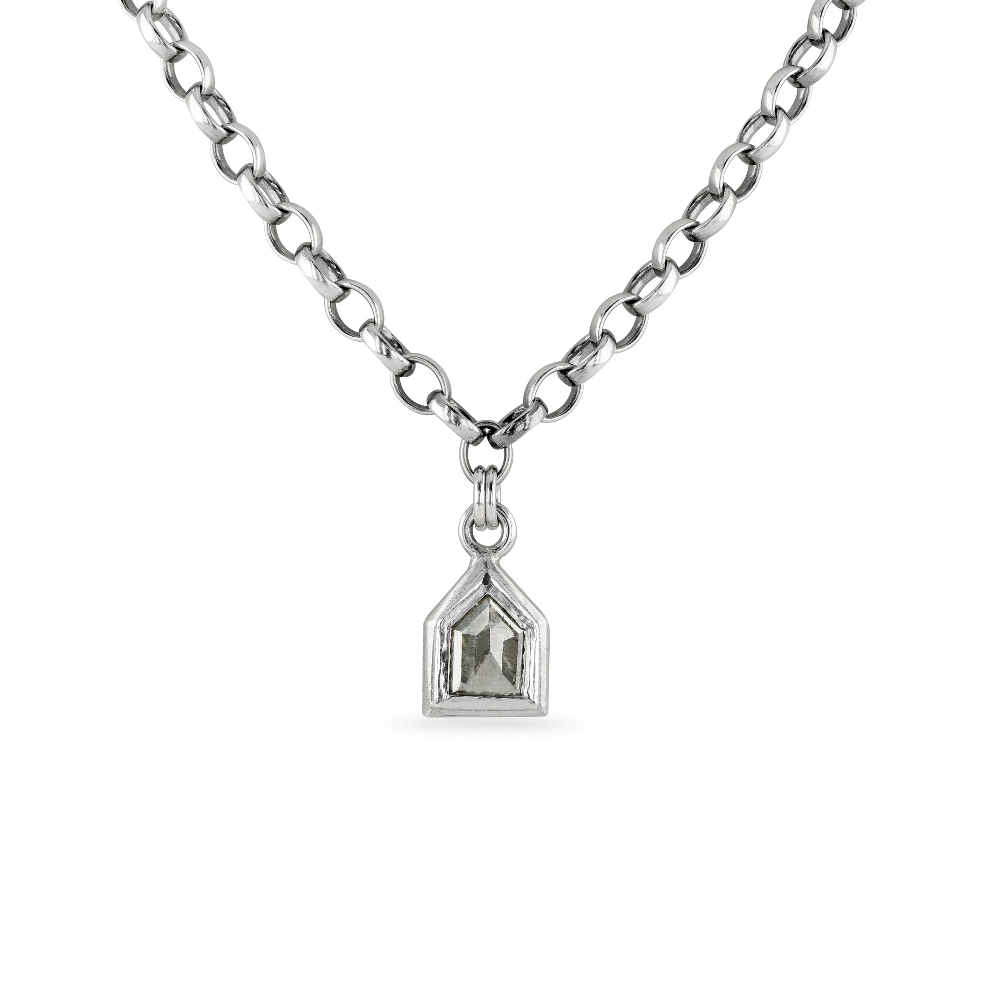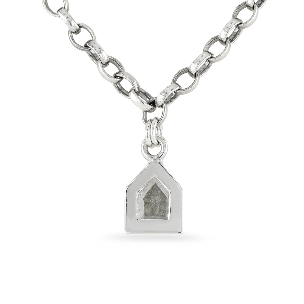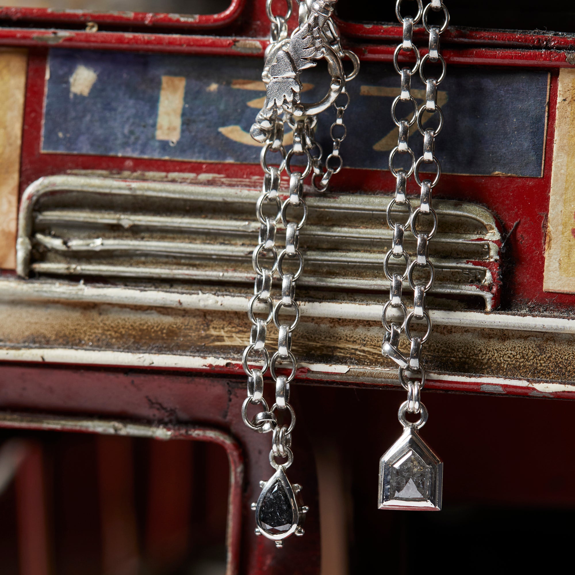 This limited edition necklace is made with our 20" long Medium Oval Belcher chain which attaches with Sophie's Classic Winged Heart T-bar clasp, symbolising love, hope and liberation. A stunning shield shaped Salt and Pepper coloured set diamond hangs from the chain. Made in Sterling silver, the necklace link is 4.5mm wide and the diamond measures 8.6mm x 6.3mm in diameter.