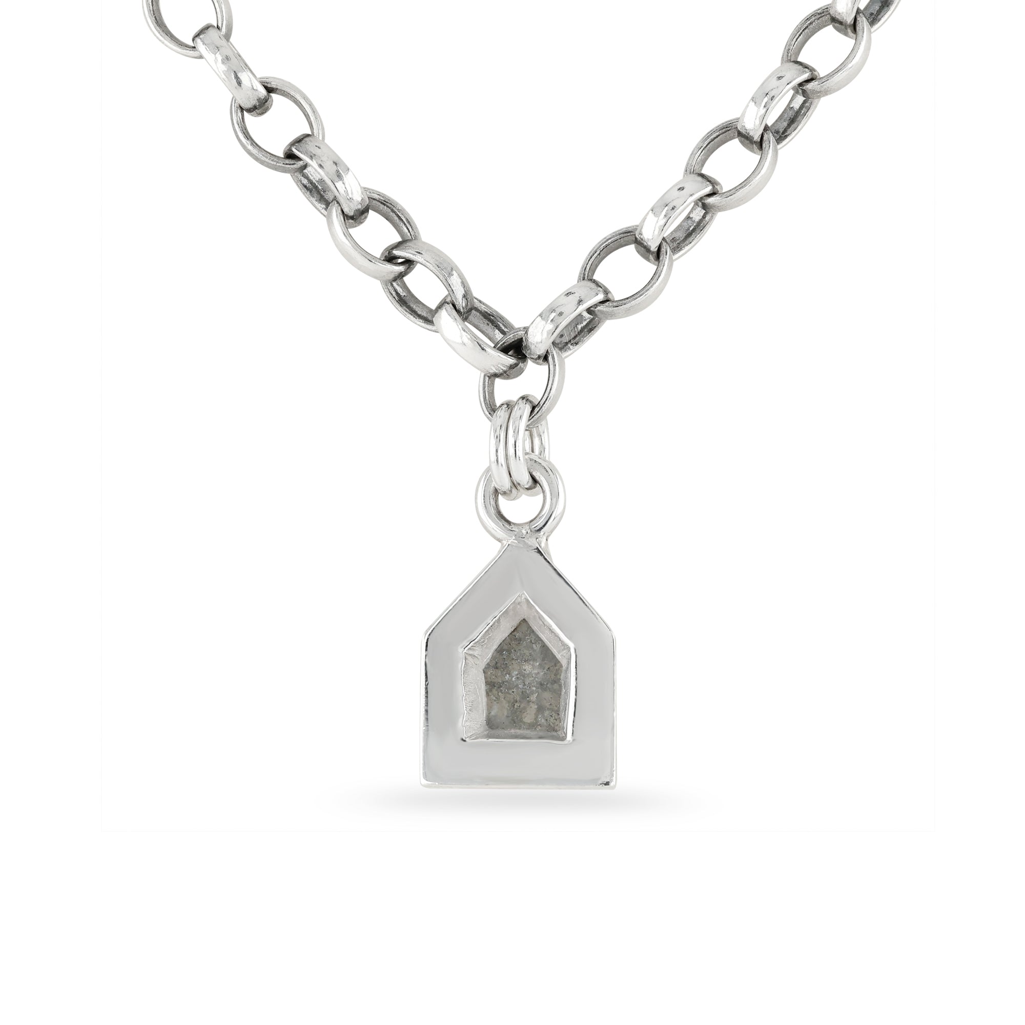 This shield shaped salt and pepper diamond necklace, made in sterling silver is a protective symbol of strength and resilience.