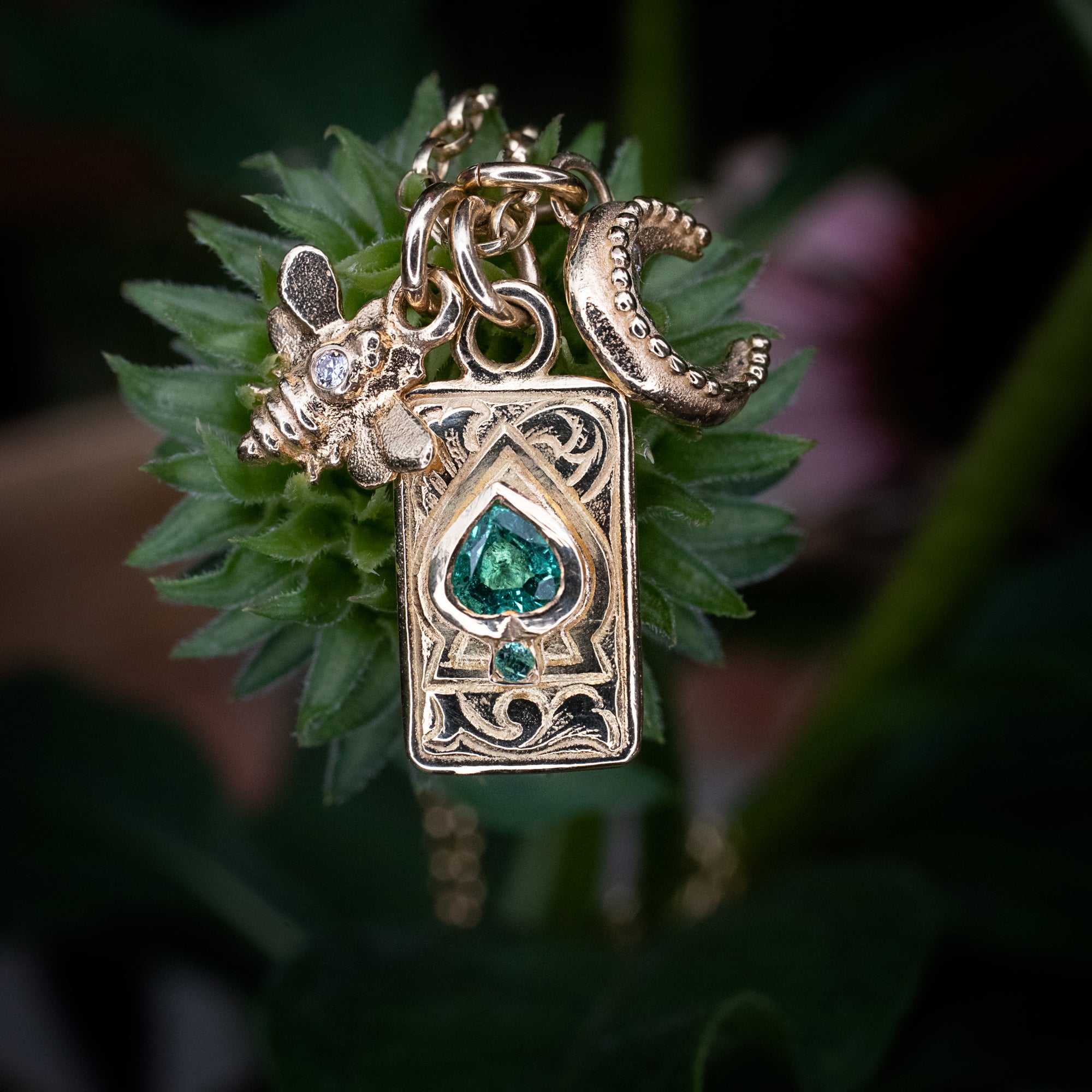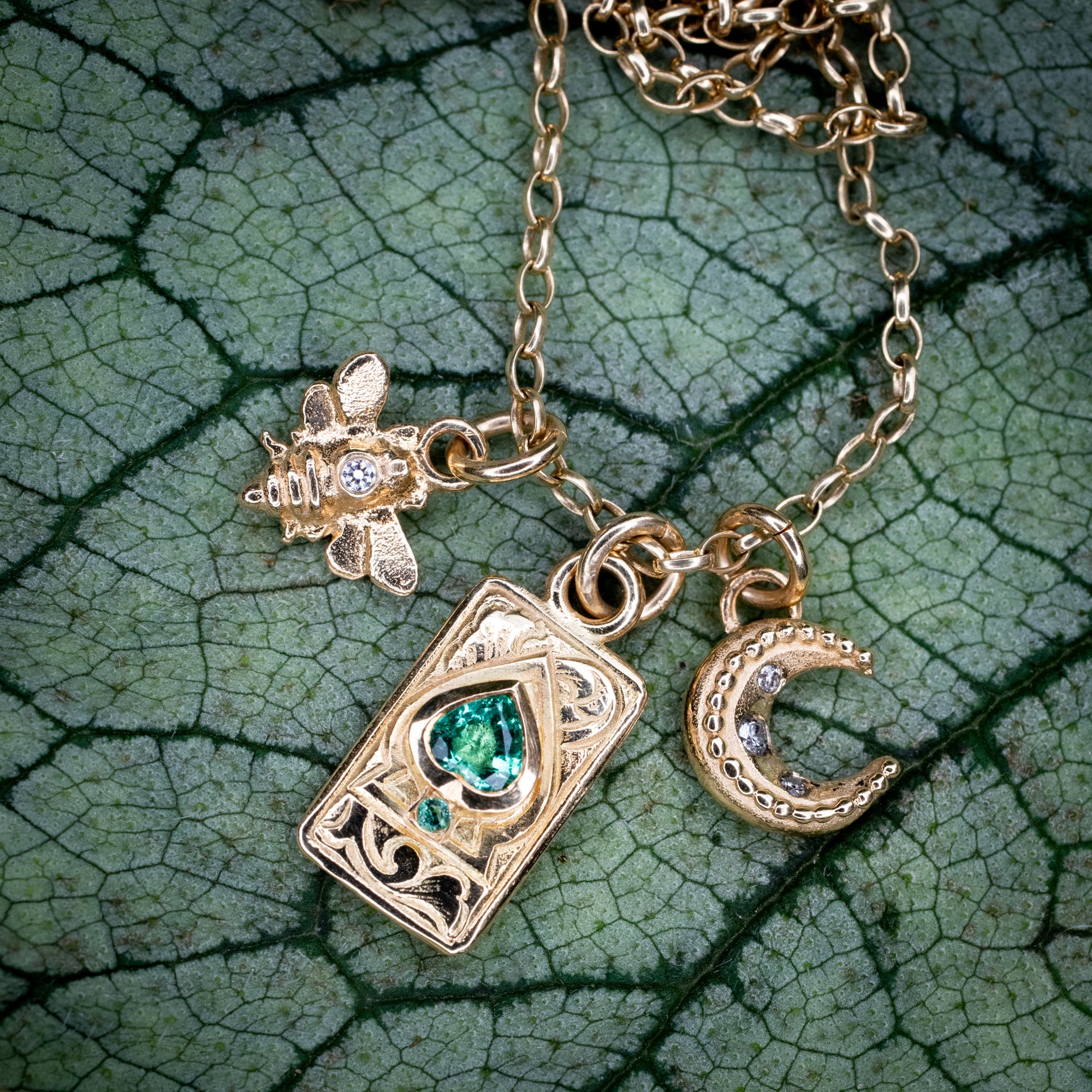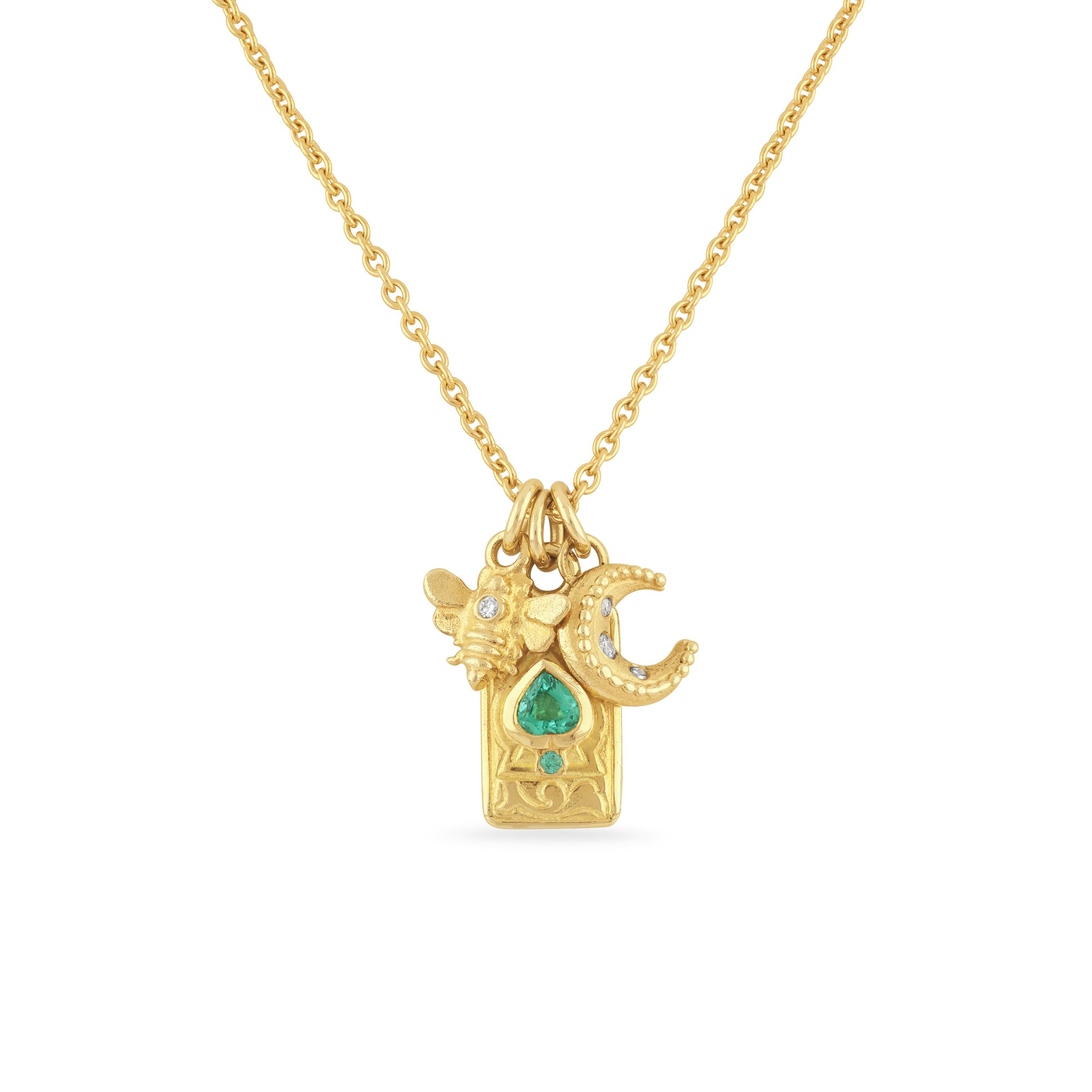 This gorgeous necklace features an exquisite cluster of charms including the intricately engraved spade suit playing card charm is set with an emerald heart and tiny round emerald and the Mini Moon and Bee charms both set with sparkling white diamonds.