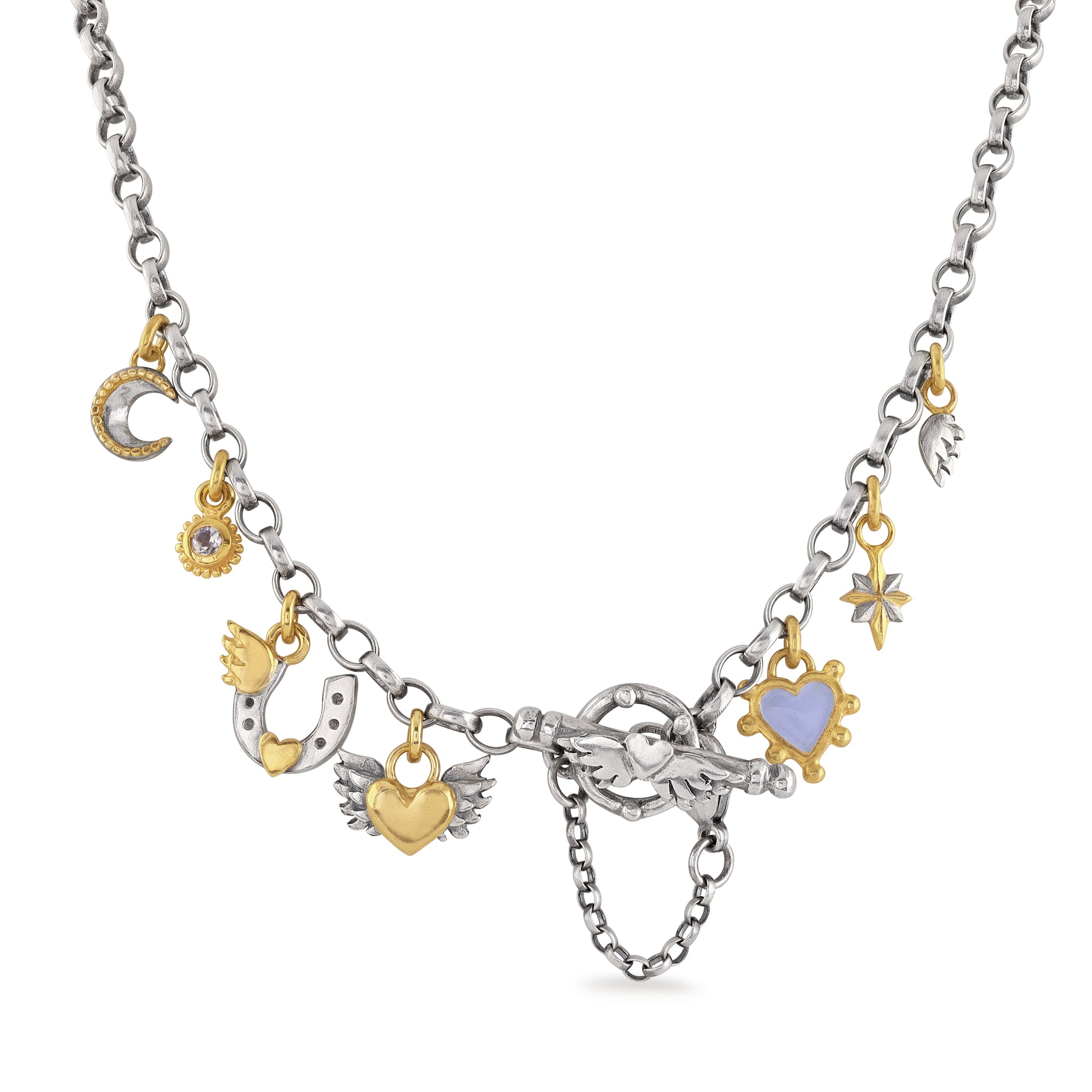 This stunning multi charm necklace, made in sterling silver with gold plate detailing and a kiln-fired enamel heart, symbolises life’s journey — each charm, from heart to star to horseshoe, represents love, freedom, and luck. Finished with our signature winged heart T-bar and clasp at the front, it embodies the distinctive Sophie Harley style.
