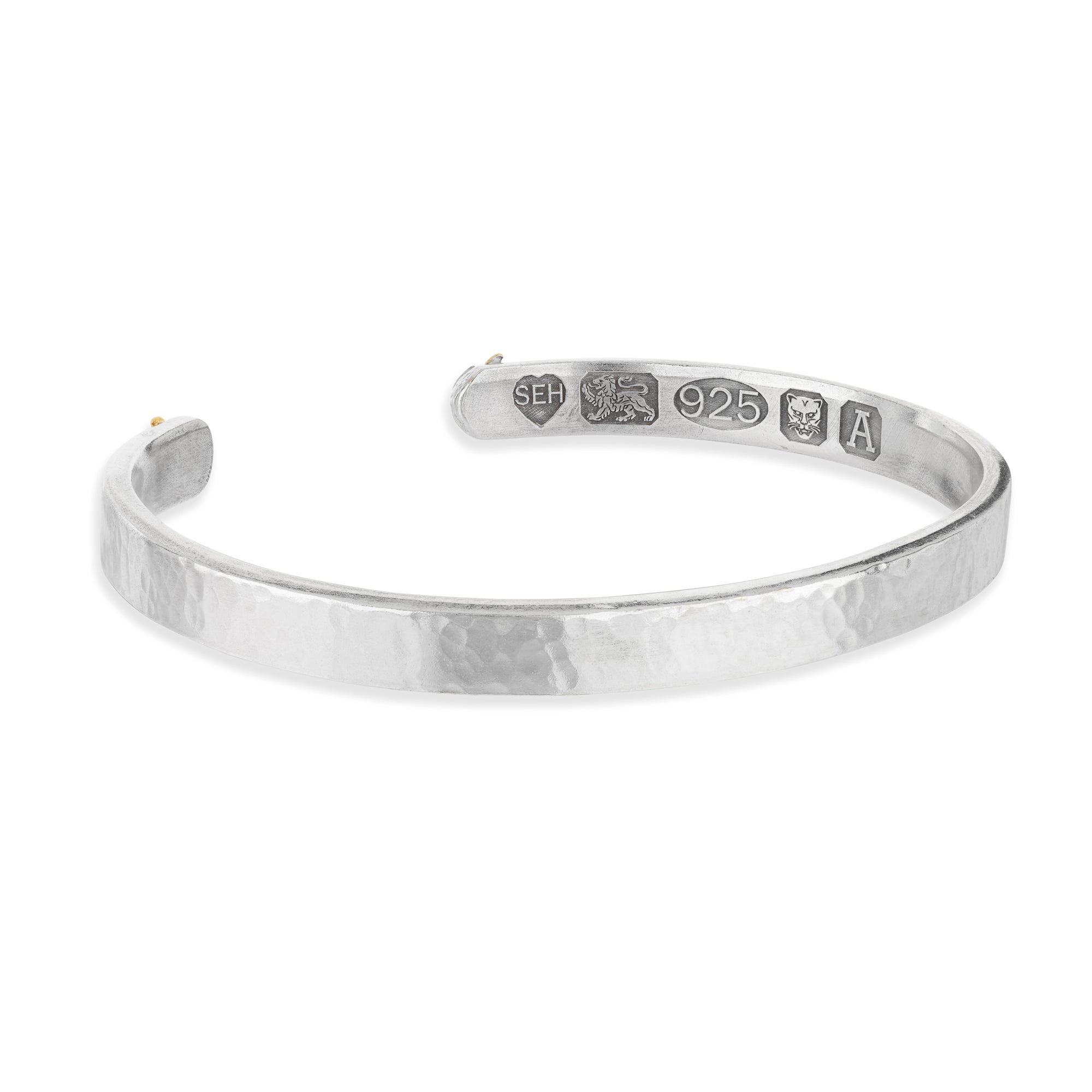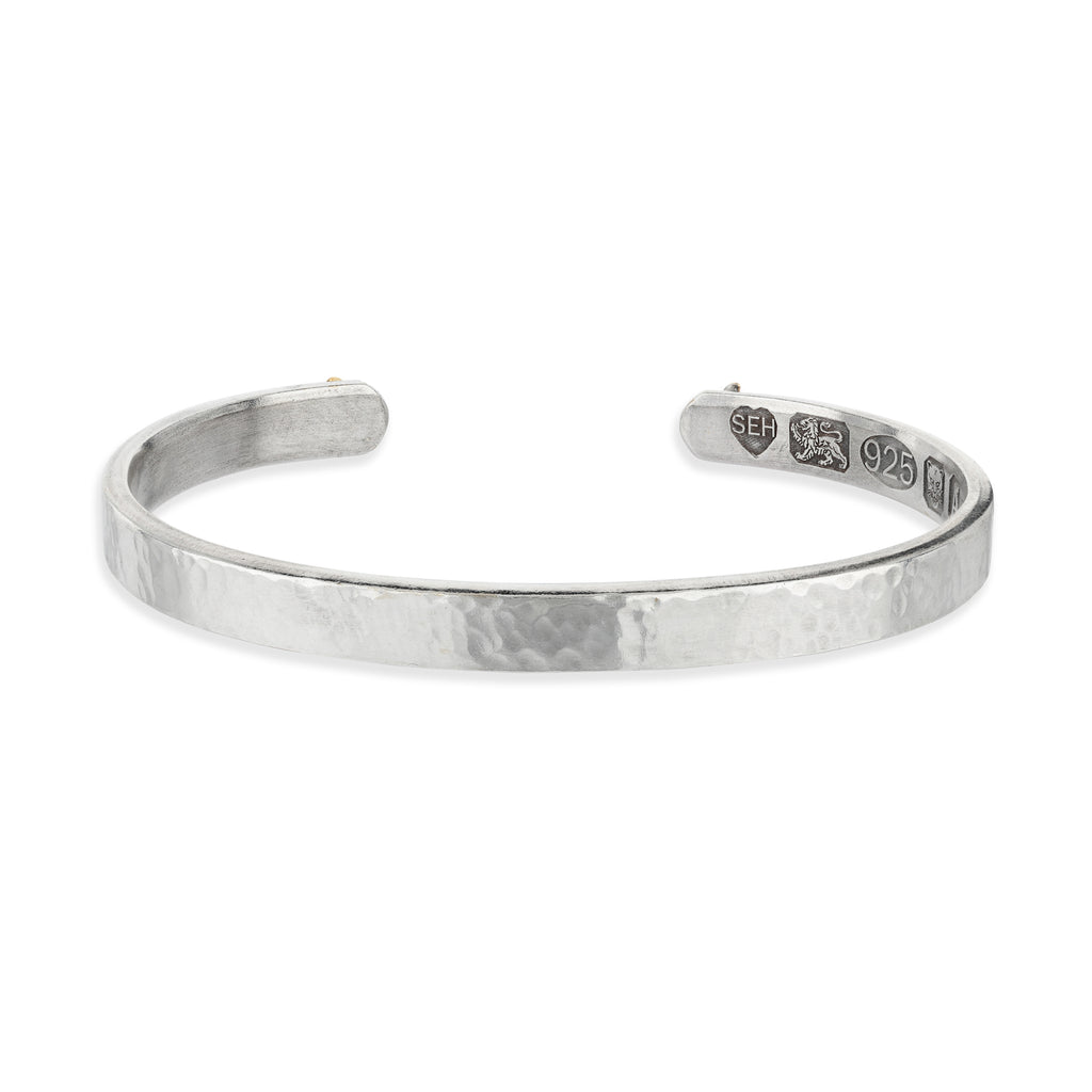 Made in sterling silver with 18ct gold plated detail, the width of the cuff is 5mm and it has a gently hammered finish along the flat outer surface.
